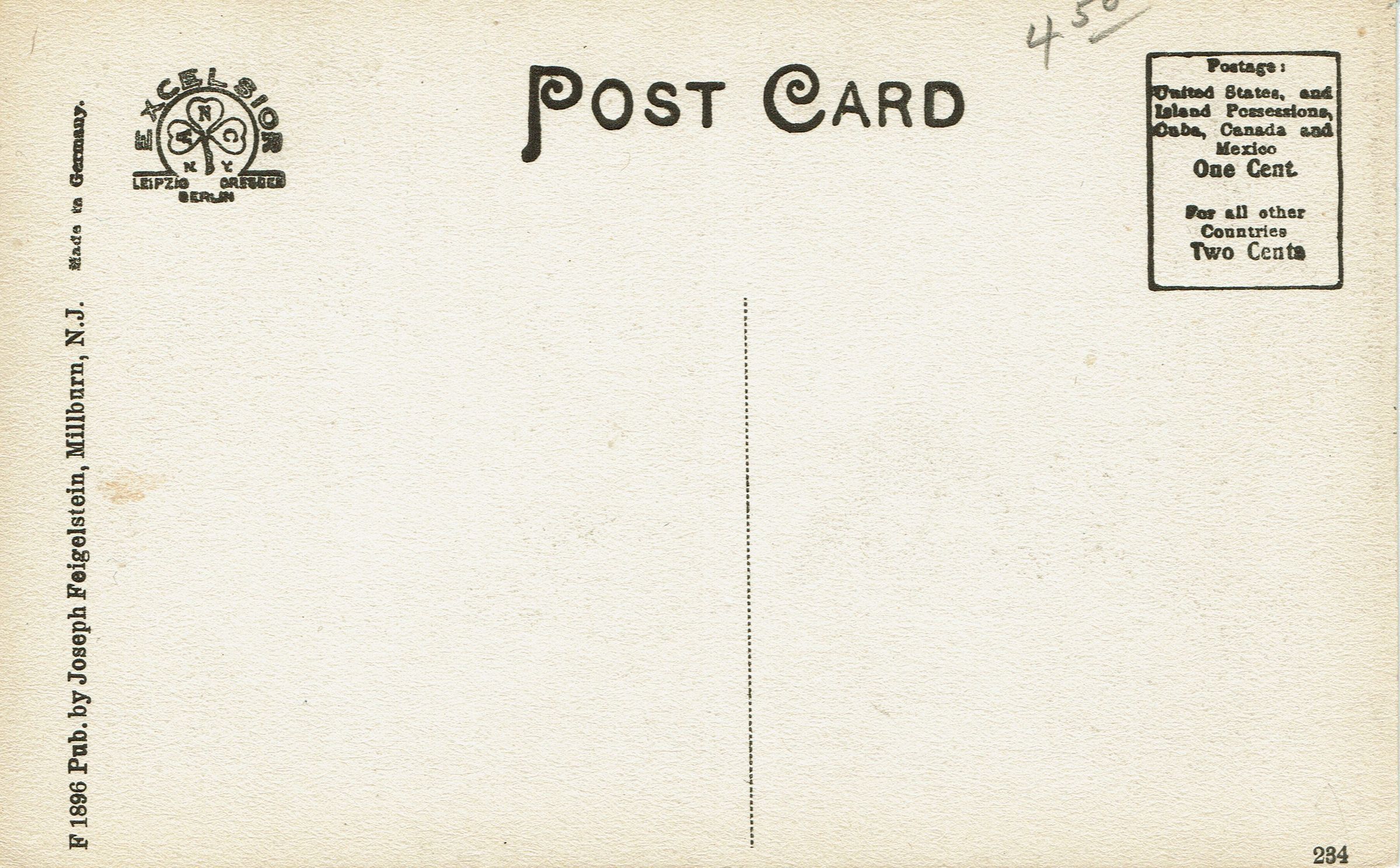 Post card was published by Joseph Feigelstein, Millburn, NJ. F 1896.Collection