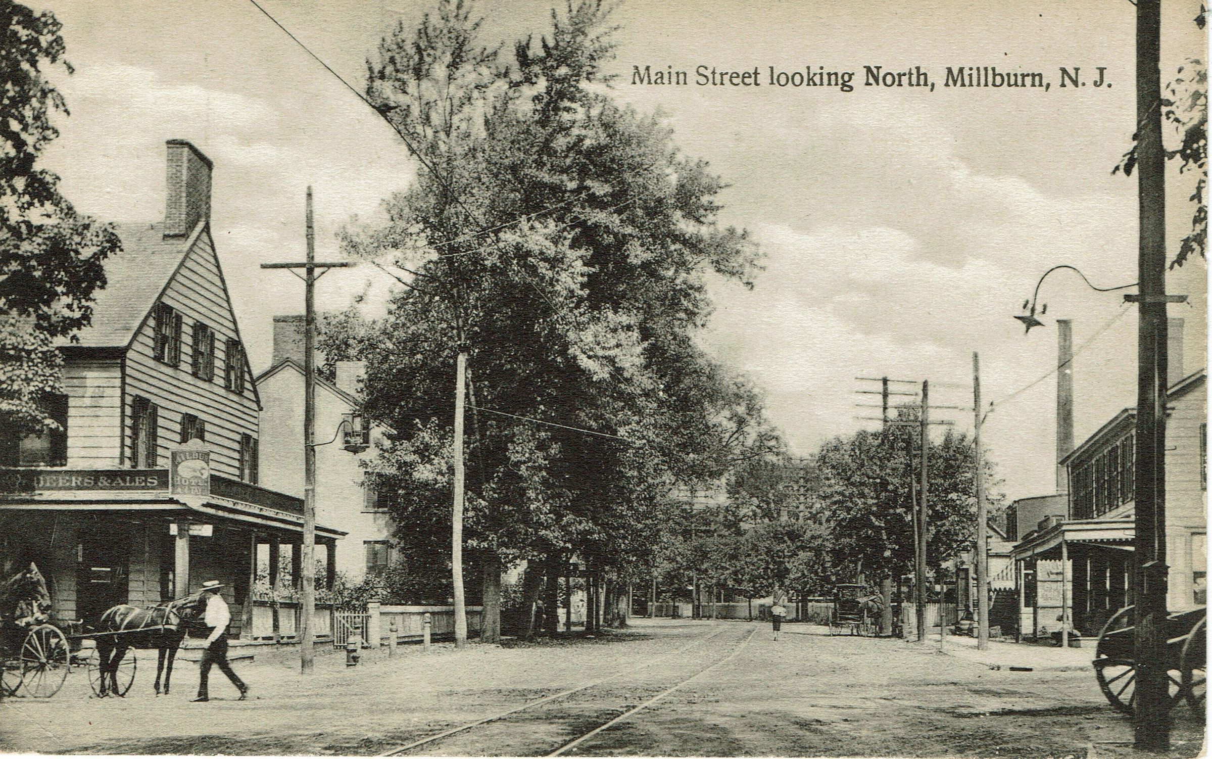 Postally unused. Main Street from Millburn Avenue Looking North. Variation on image # 249 from Centennial Photo Collection and in postcards (2023.197.052) . In this view, there is a man crossing Main Street and a horse and carriage near the Millburn Hotel.