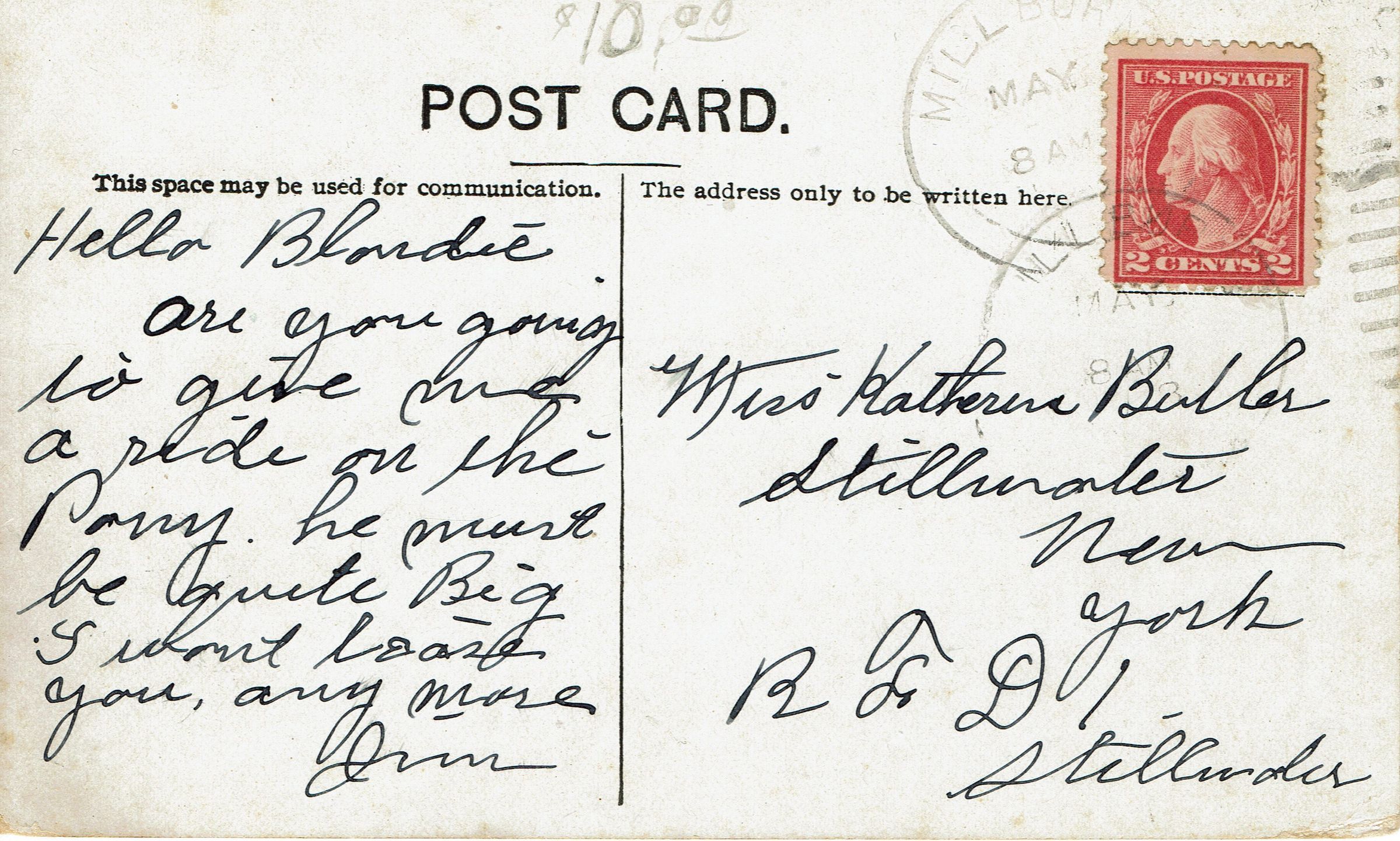Photographic postcard of Main Street, Millburn Looking North. View is taken near Taylor Park with the intersection of Millburn Avenue and Main Street in the distance. The postcard is postmarked Millburn, May, 8 am (year is illegible). Postcard is addressed to Mrs. Katherine Butler Stillwater, New York. R.F.D. Stillwater.Collection