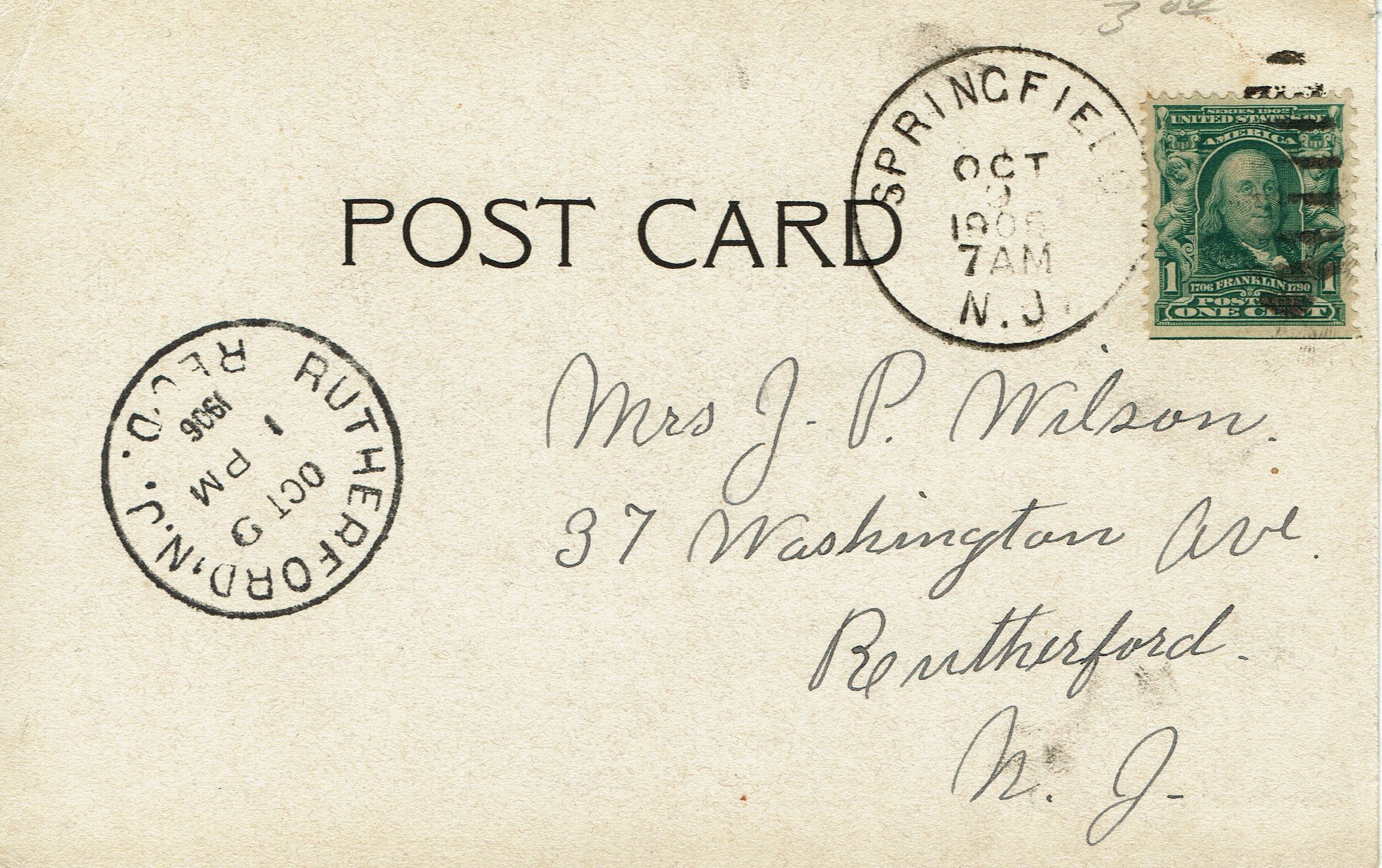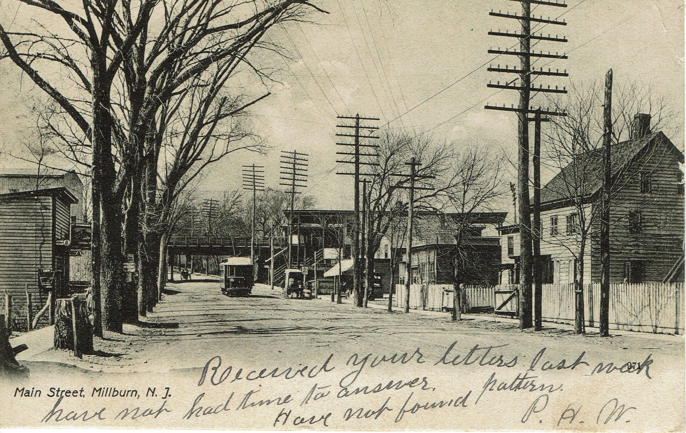 B&W photographic postcard of Main Street, Millburn looking northward toward the Lackawanna Railroad Bridge with a Trolley car, Horse-Drawn Wagon and Car traveling on the street. Postmarked Springfield, NJ October 9, 1906 7:00 am arrived Rutherford, NJ October 9, 1906 at 1:00 pm. Card is addressed to Mrs. J.P. Wilson, 37 Wshington Avenue, Rutherford, N.J. Message on front of card reads: "Received your letters last week. Have not had time to answer. Have not found pattern. P.H.W."Collection