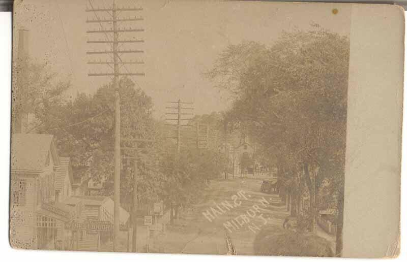 Real Photo Postcard of Main street in Millburn looking South from D.L.&W. tracks. Visible are the Wine & Liquor House and smokestack.Acquisition