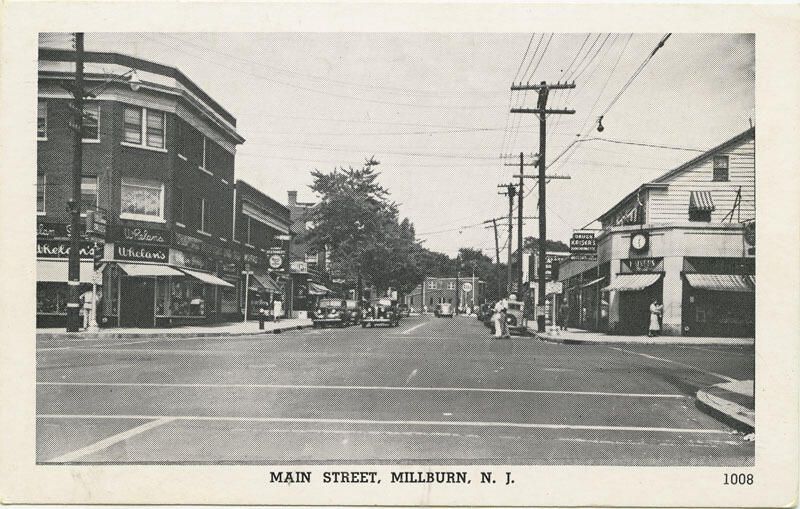 Black and white, glossy, unused, undated, real-photo postcard view of Main Street in Millburn. Although the postcard is undated and unused, an identical one in the historical society collection has a stamp and cancellation that celebrate Millburn's 1957 centennial. The taller brick building on the left corner of Main and MIllburn was Whelan's drug store and the smaller, light-colored building on the right was Kaiser's drug store. Straight ahead, in the background, is an Esso sign, where the Esso station was (now a town parking lot). There is a very light overall yellowing on both sides of the postcard and a small curved crease on the right front, across the upper level of the Kaiser's building. The corners of the postcard are very slightly bumped.Acquisition