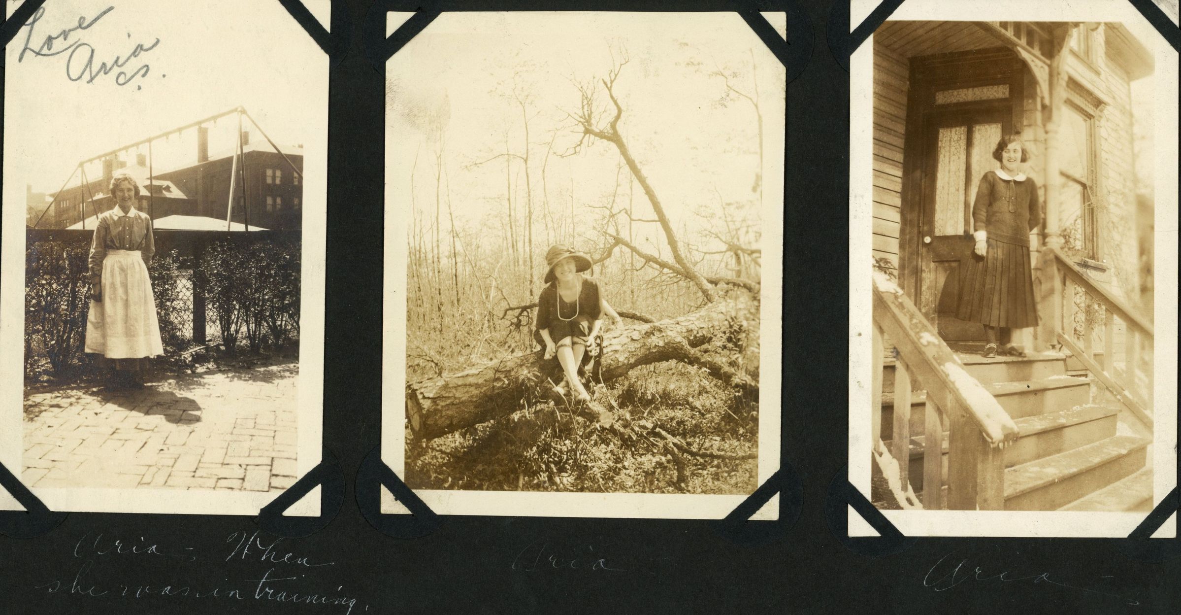 Photographs on page 5 of the Mangold family scrapbook showing "Aria" while in Training and other photographs, possibly at the 28 Rector Street House. The full identity of Aria is unknown.Photograph Details