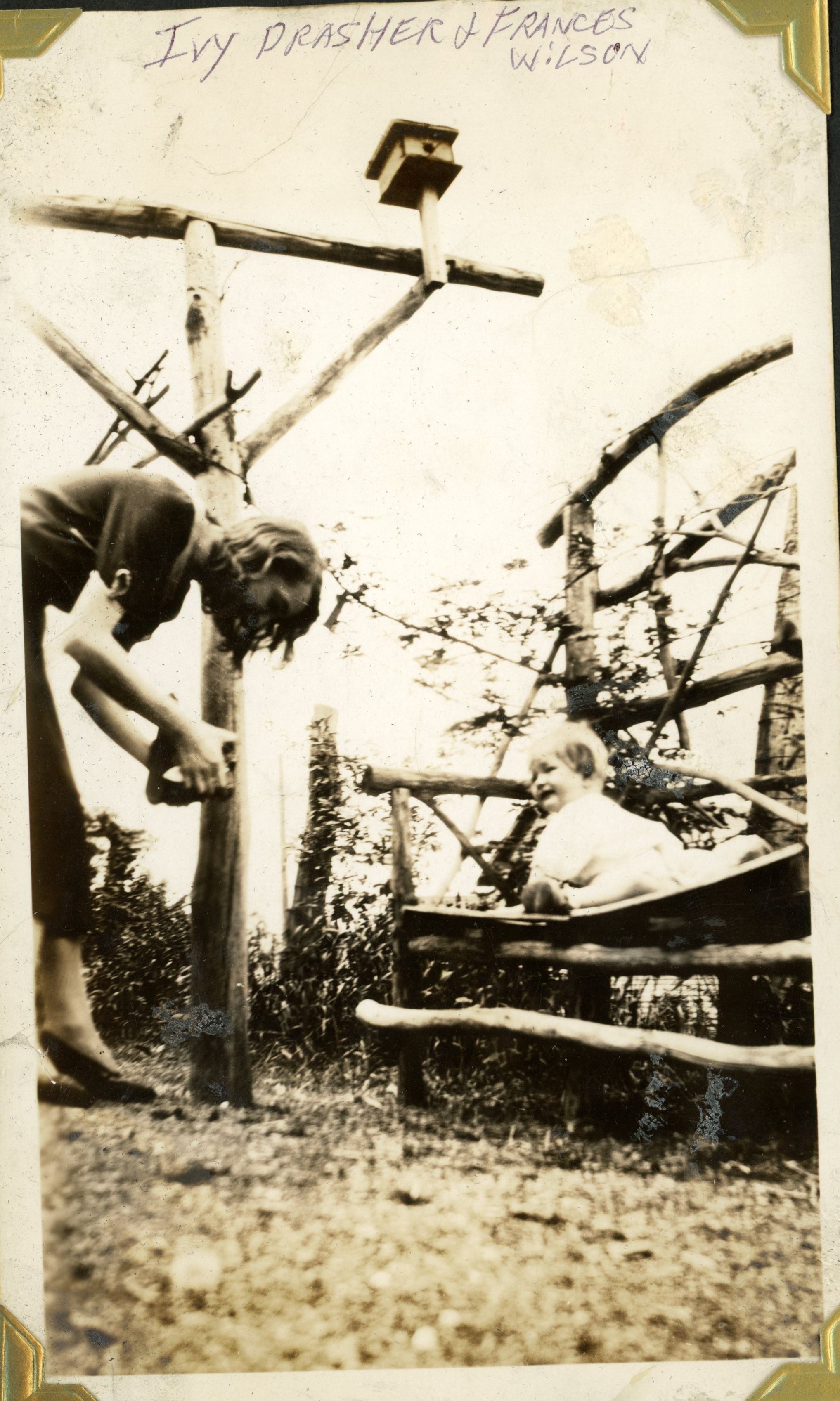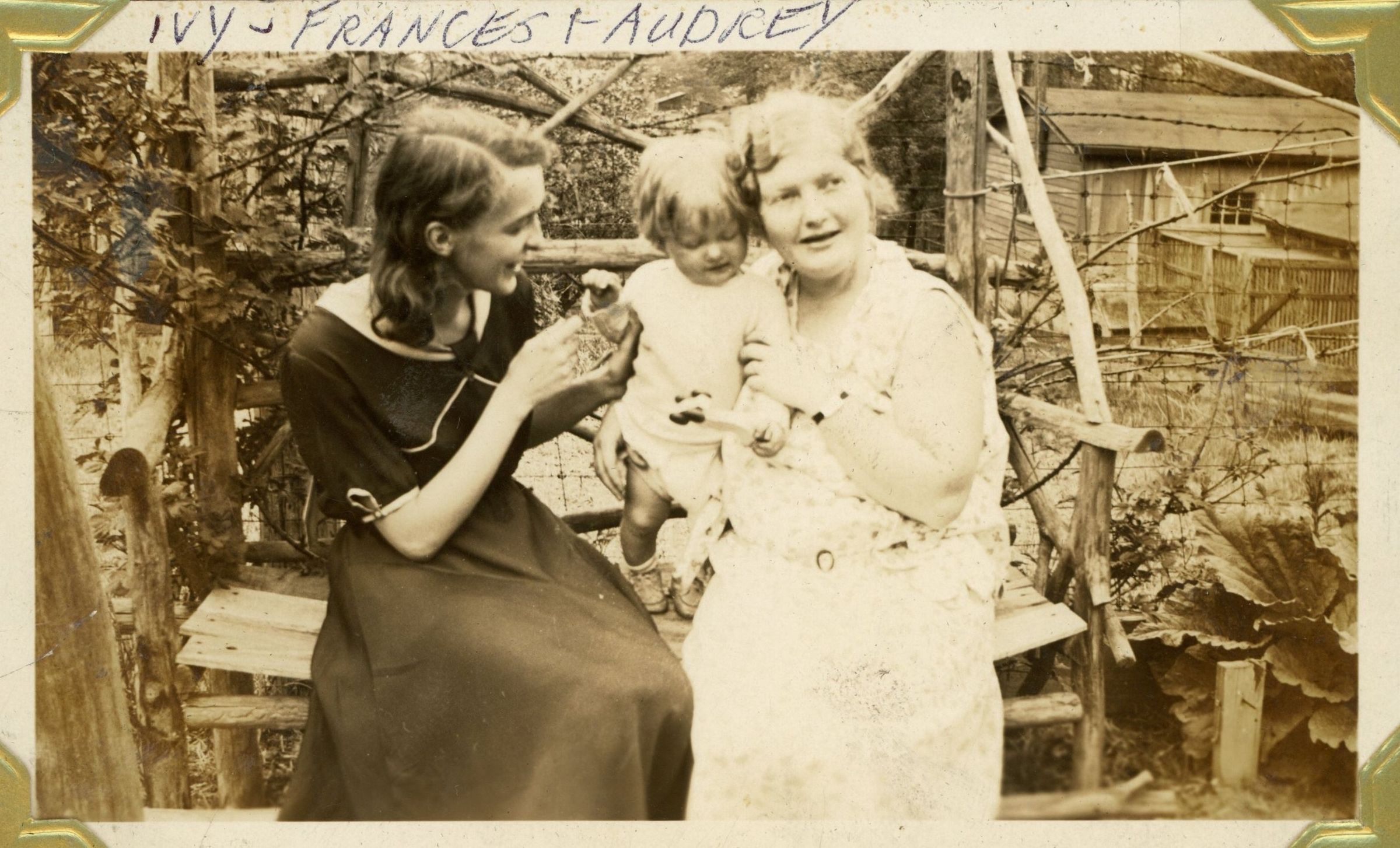 Group photograph of Ivy Arlynn Drasher Mulhearn (1911-1997) Francis Wilson (1931-2024) and Audrey Mangold Wilson (1908-1992) from the Mangold family scrapbook, p. 8.Photograph Details