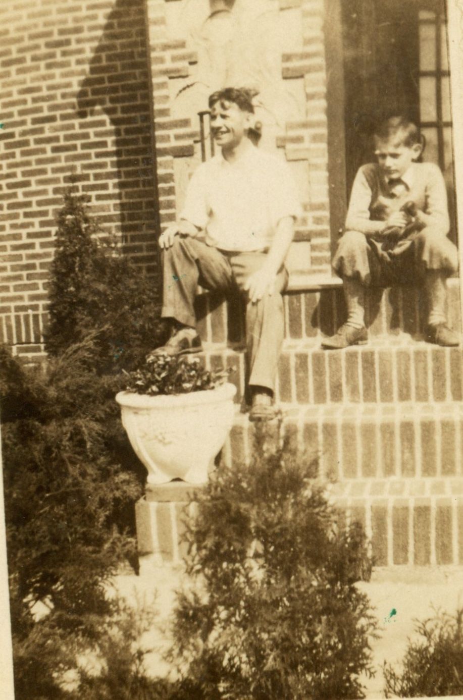Photograph of John Thomas Wilson and John Mahlan Mangold (1916-1930) on the steps in front of the Mangold house at 60 Whittingham Terrace.Photograph Details