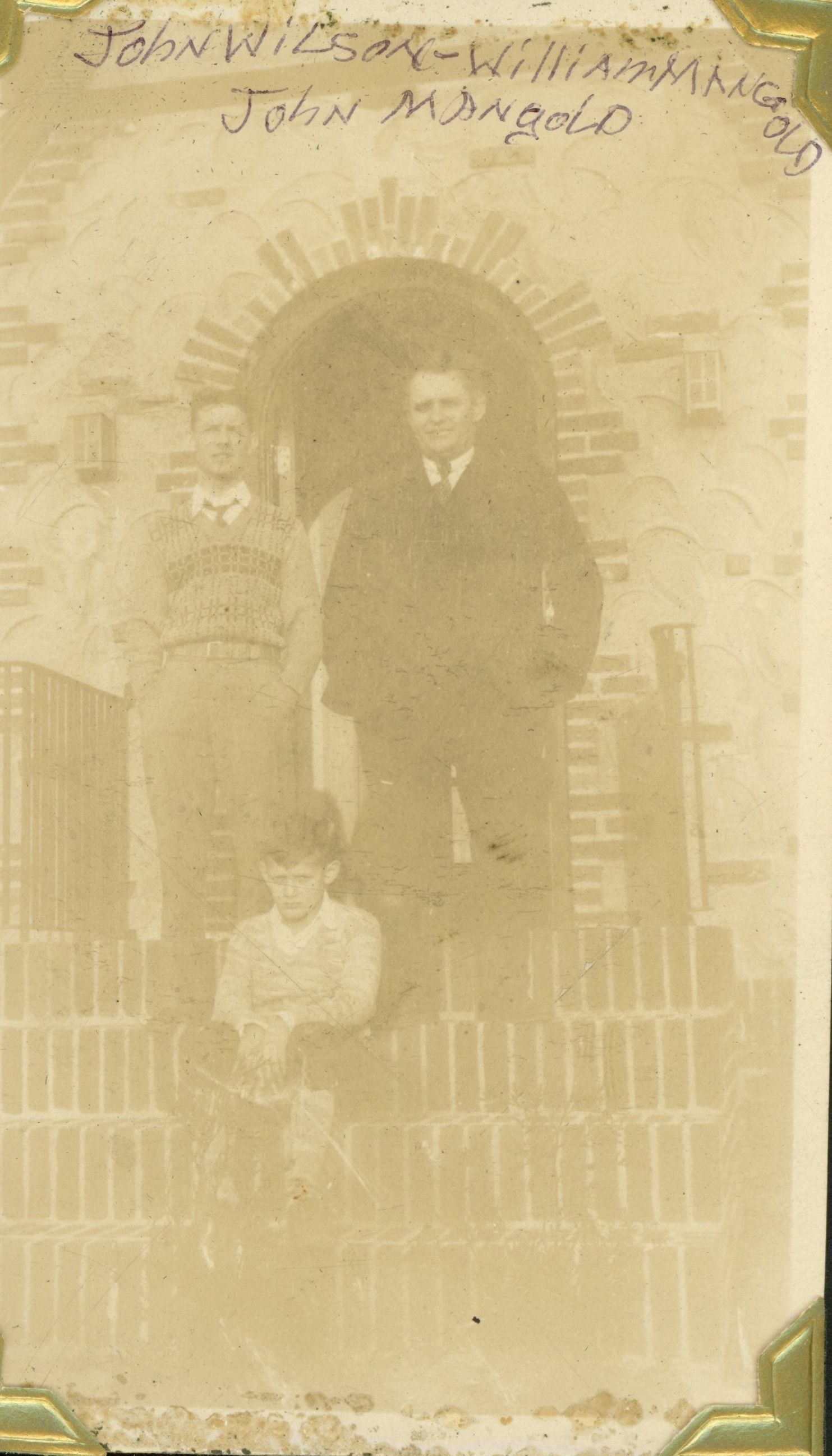 Photograph of William Mangold and John Wilson standing in front of the doorway at Whittingham Terrace with John Mahlan Mangold (William's youngest son) seated on the stoop from the Mangold photo album. The photograph probably dates to c. 1928.Photograph Details