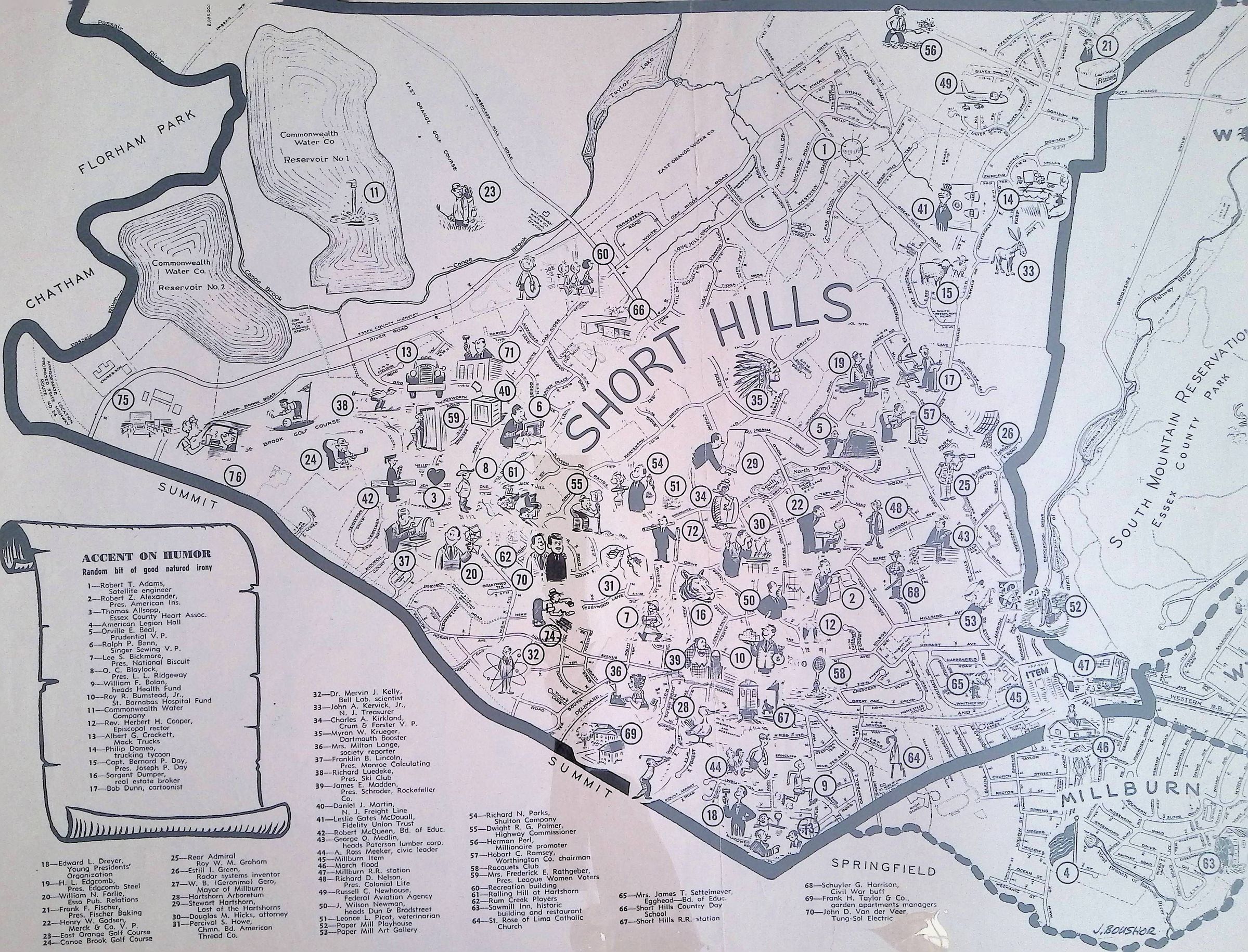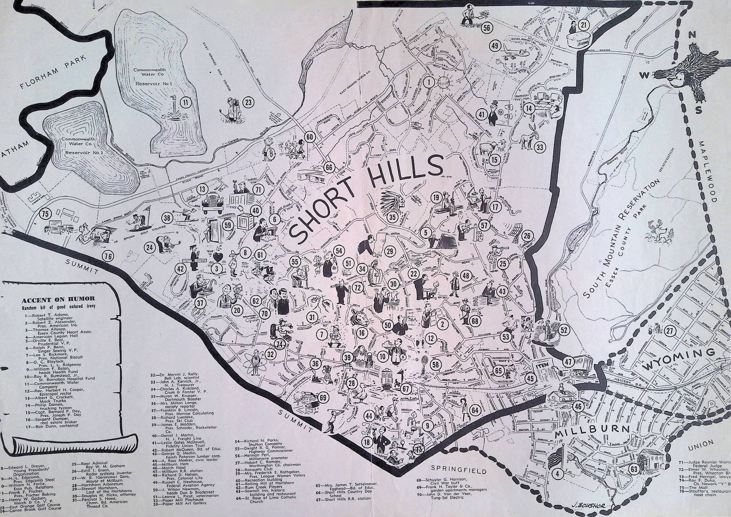 Humorous map highlight people and places of Millburn-Short Hills. Suburban Life Magazine, May, 1962, pp. 54-55.Acquisition