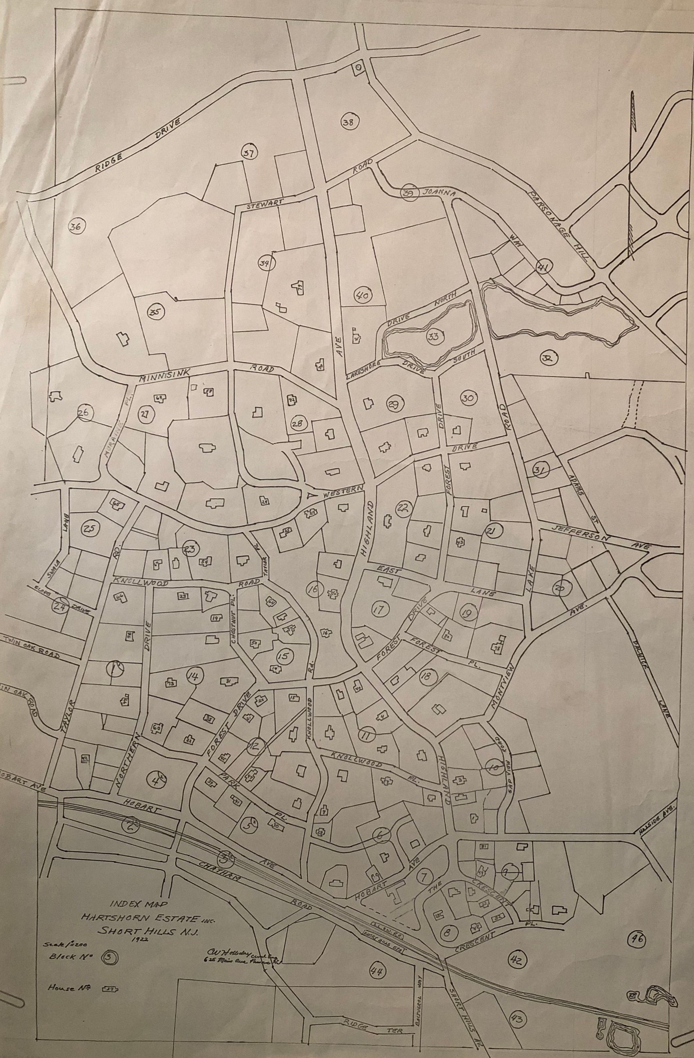 C.W. Holliday Index Map of Hartshorn Estate, Inc., Short Hills, NJ, 1922. Map indicating block number and house number for Hartshorn Estate Properties in Short Hills.Acquisition