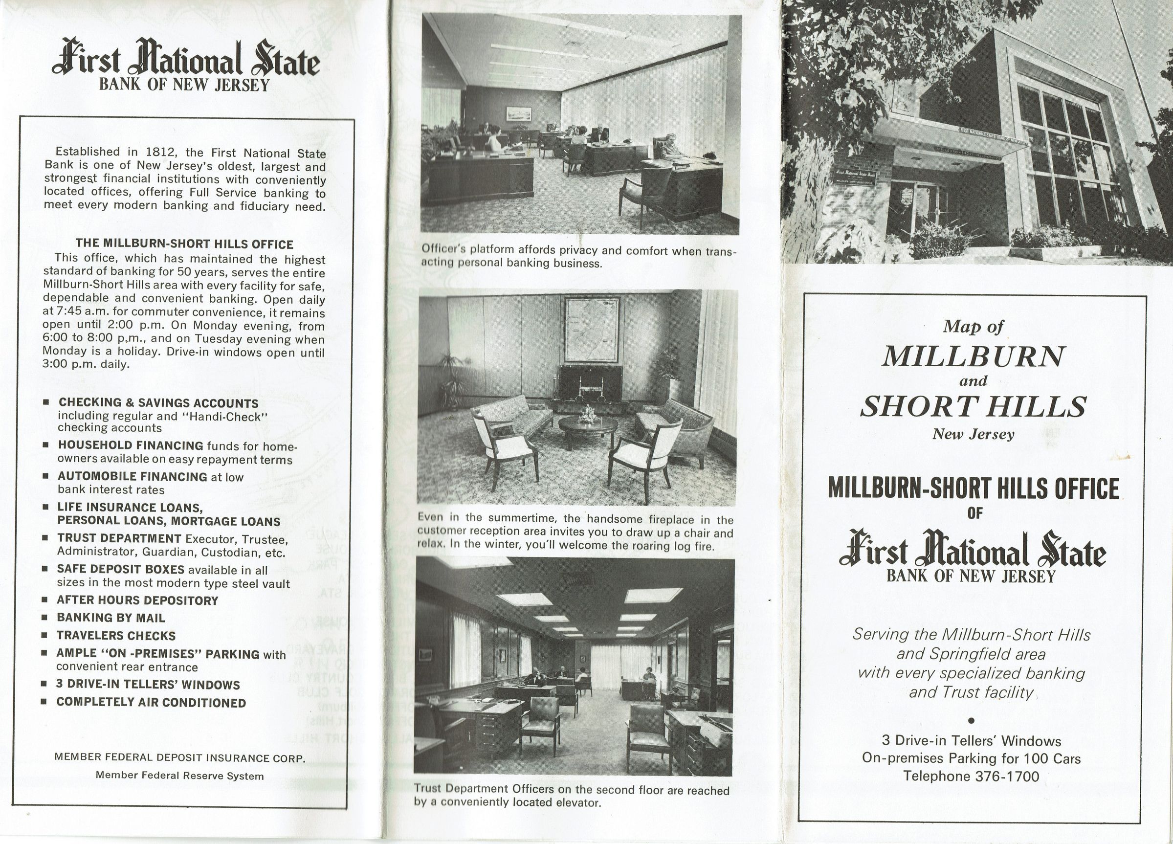 Ca. 1971 map of Millburn and Short Hills, from the Millburn-Short Hills Office of the First National State Bank of New Jersey. The map was apparently given to bank patrons and features interior photos of the bank. The date for the map was approximated from the fact that Deerfield School, which opened in 1962, appears on the map. Short Hills Country Day School is no longer listed, but Pingry is listed.Acquisition