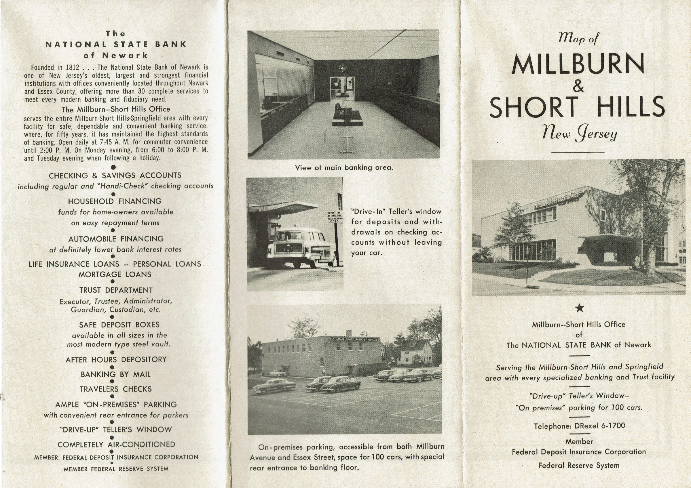 Map of Millburn & Short Hills, New Jersey. Undated. Sponsored by the Millburn-Short Hills Office of The National State Bank of Newark. The First National Bank of Millburn merged with the National State Bank of Newark in 1956. Illustrated with B&W photographs of the National State Bank of Newark, photographs of the schools and a description of Millburn Short Hills as "The Towns Among the Hills." The map must have been published prior to 1958, when Hartshorn School was built, as neither Hartshorn nor Deerfield schools are on the map.Acquisition