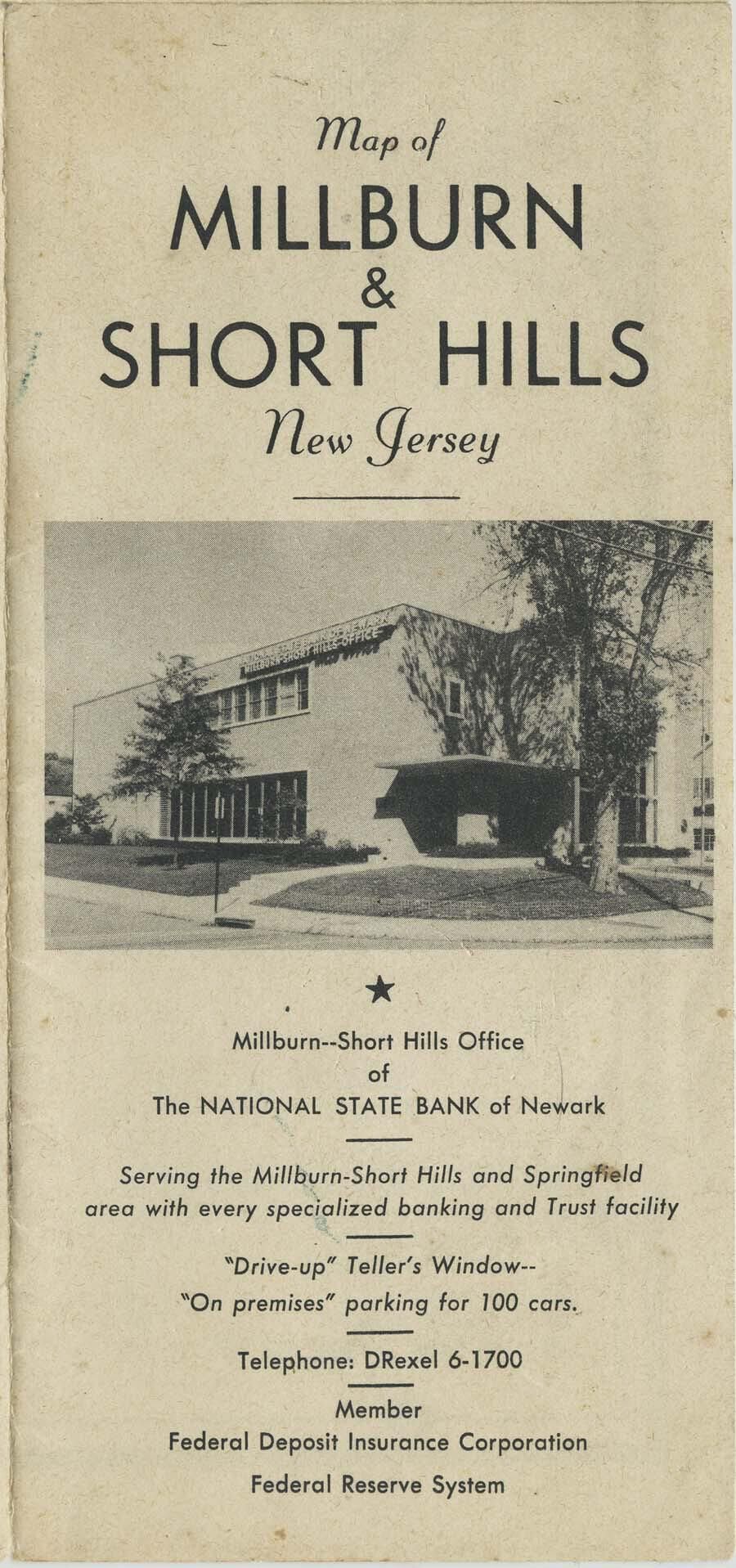 Undated, but ca. 1956 map of Millburn Township in Essex County, NJ. The map was apparently printed for the National State Bank of Newark's Millburn-Short Hills office at 397 Millburn Avenue in Millburn. The front cover of the (folded) map has photos of the National State Bank and when unfolded that same side has b/w photos of local schools and the Racquets and Short Hills Clubs. The reverse side is a map of Millburn and Short Hills.Acquisition
