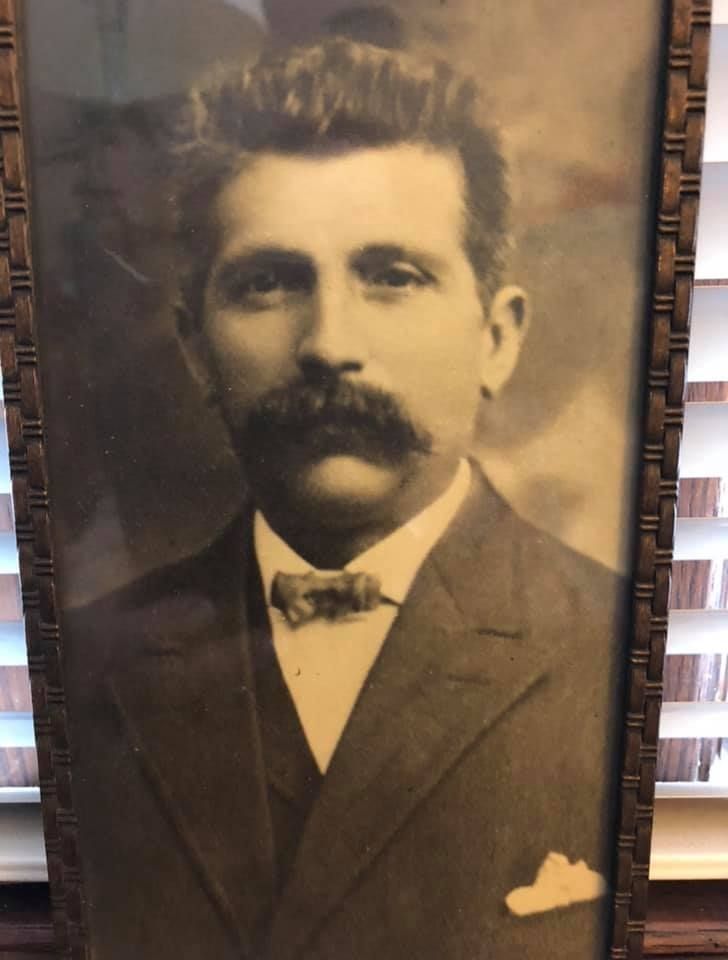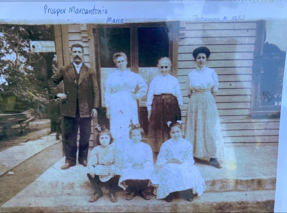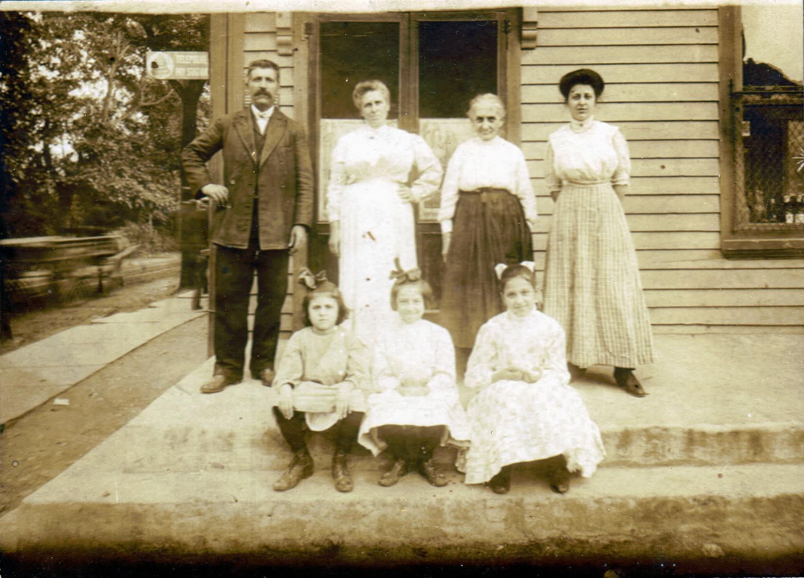 Photograph of the Marcantonio family. Prosper and Marie Donato Marcantonio came to Millburn in the late 1800s. They purchased land on Taylor and Main Streets (grocery store and saloon)-now 81 & 83 Main Street. According to notes in MSHS files, 5 generations of Marcantonios lived in Millburn. Prosper and Marie had three daughters. Prosper is standing with his right hand on his hip, next to him is his wife Marie, Johanna is standing at the far right.