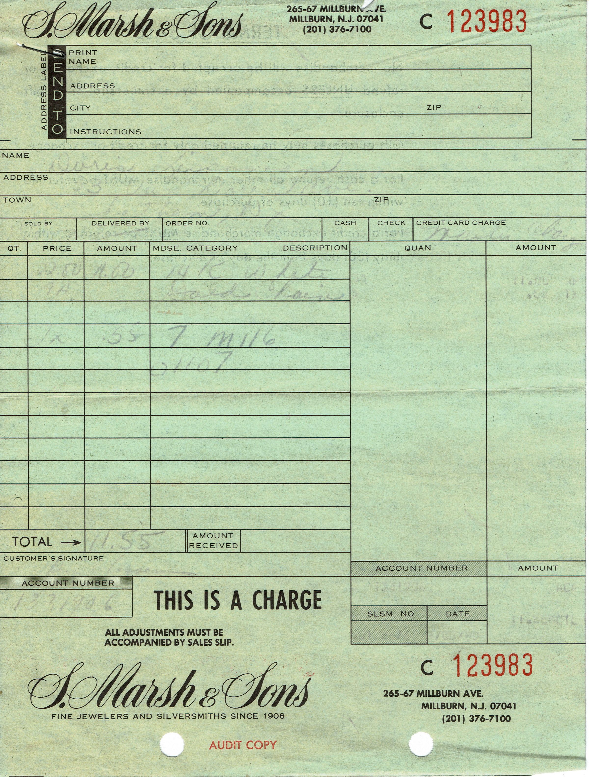 Receipt for purchased made at S. Marsh & Sons, 265-67 Millburn Avenue, Millburn, NJ 07041. Receipt is for Doris Liss. Undated.Acquisition