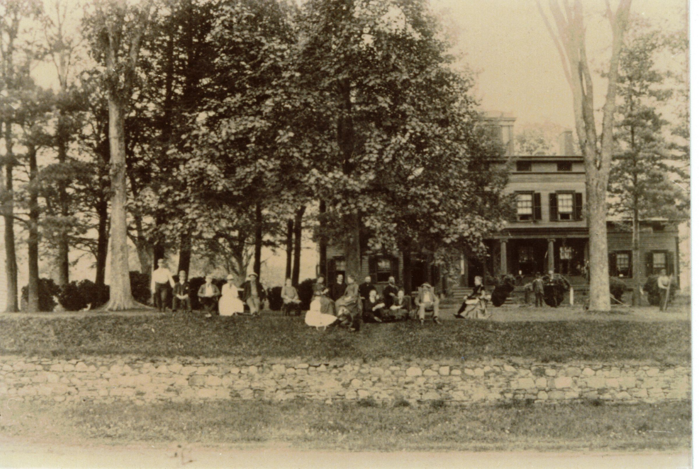 Marshall Family watching bike race in front of the house at on Millburn Avenue, between Wyoming and Myrtle Avenues (187 Millburn Avenue). The house was built by a descendant of Colonel Aaron Hand and later became part of the Whittingham Estate (family owned most of South Mountain Estates). Walton Condit and Elizabeth R. Whittingham moved to the house, which they called "Boxwood," in 1883. Later site of Lord & Taylor, then Fresh Fields and Home Place. In 2022, site of CVS & Trader Joes.