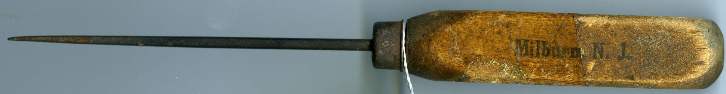 Wooden ice pick with brown wood base measuring 3.75" X 7/8" and metal pick measuring 4.75" (including 5/16" metal circular base). Wooden handle is very worn and very soiled with old clear 5/8" tape encircling it. There is writing on all four sides of wood base in black print. Side one: "R.E. MARSHALL", side two: "Millburn, N.J.", side three: "Phone Millburn 1652", side four: "Pure, Clear, Made Most Sanitarily, "The Ice You Will Ultimately Use" Quality and Service Throughout the Year". Metal pick portion of tool is worn, with areas of rust.Acquisition