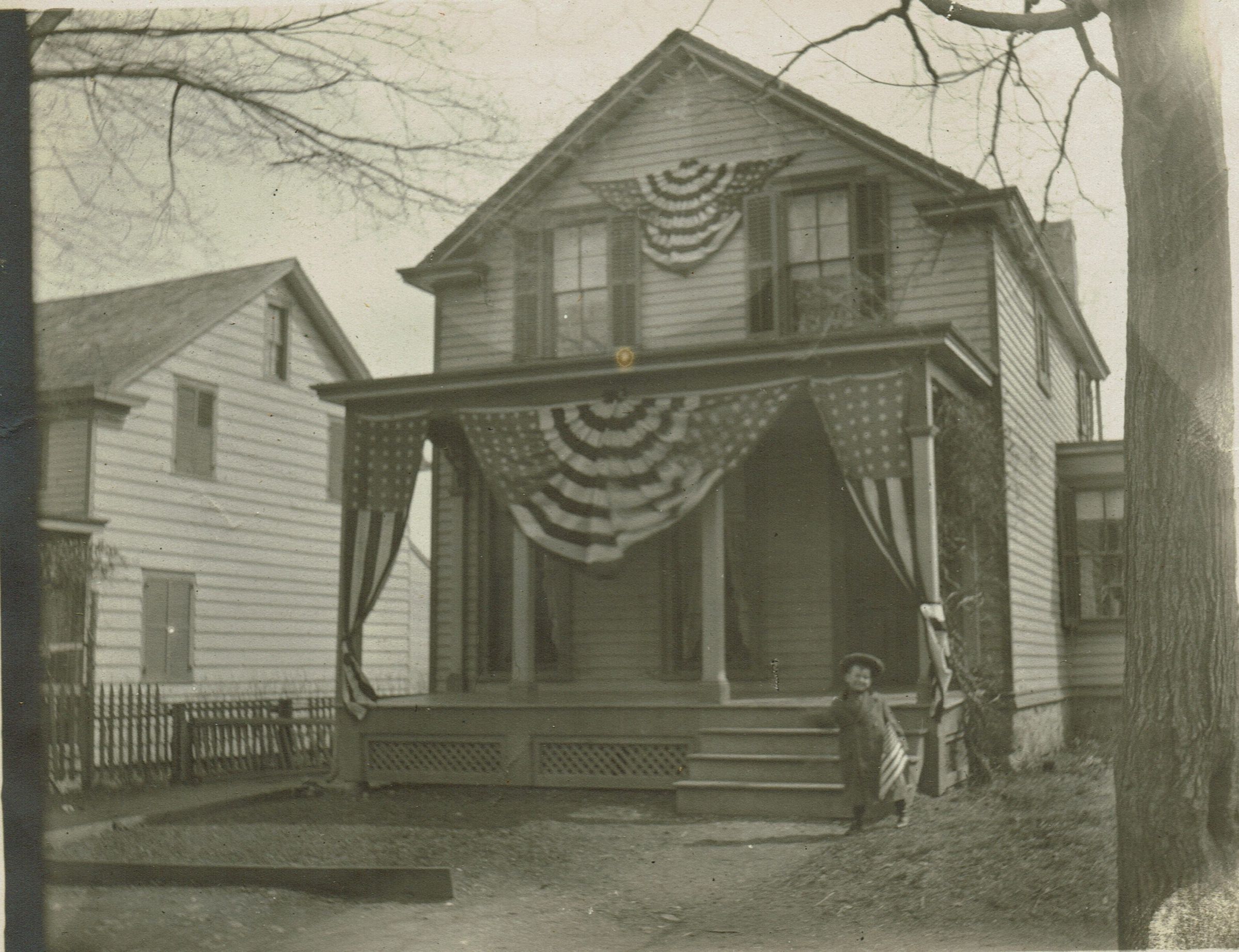 Marshall-Schmidt Album: Child With Flag in Front of House with Patriotic BuntingEntry/Object ID