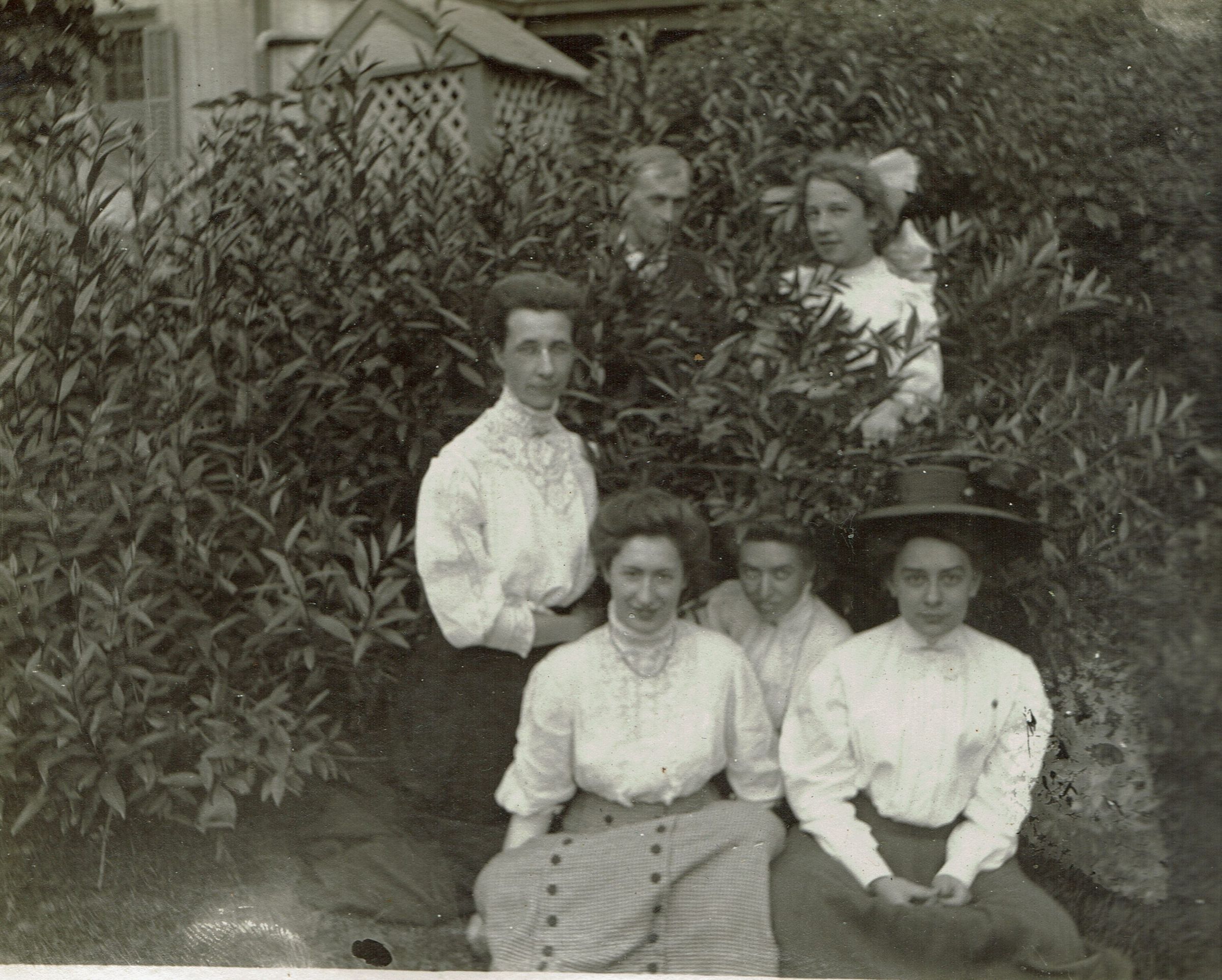 Photograph with Elizabeth Schmidt-Marshall (far left), 3 unidentified women seated, a young man and another women standing in a garden. Marshall-Schmidt Album, page 42, top image.Collection