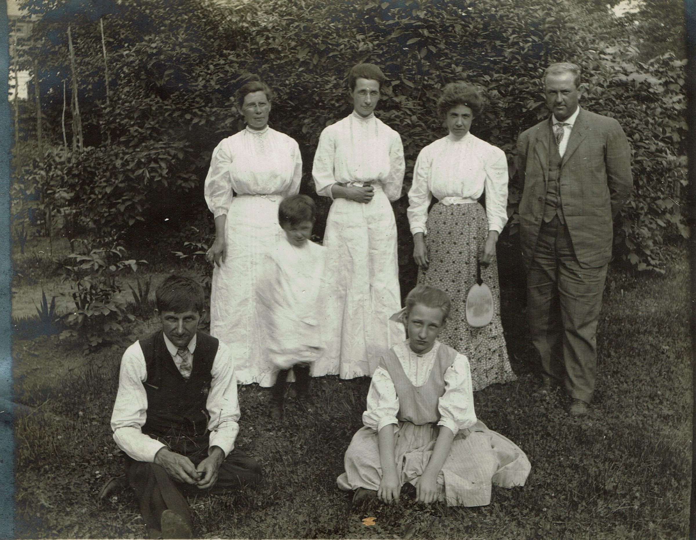 Photograph of Elizabeth Schmidt Marshall standing and Margaret Marshall seated in the grass. Other family members are unidentified. Marshall-Schmidt Album, page 50, top image.Collection