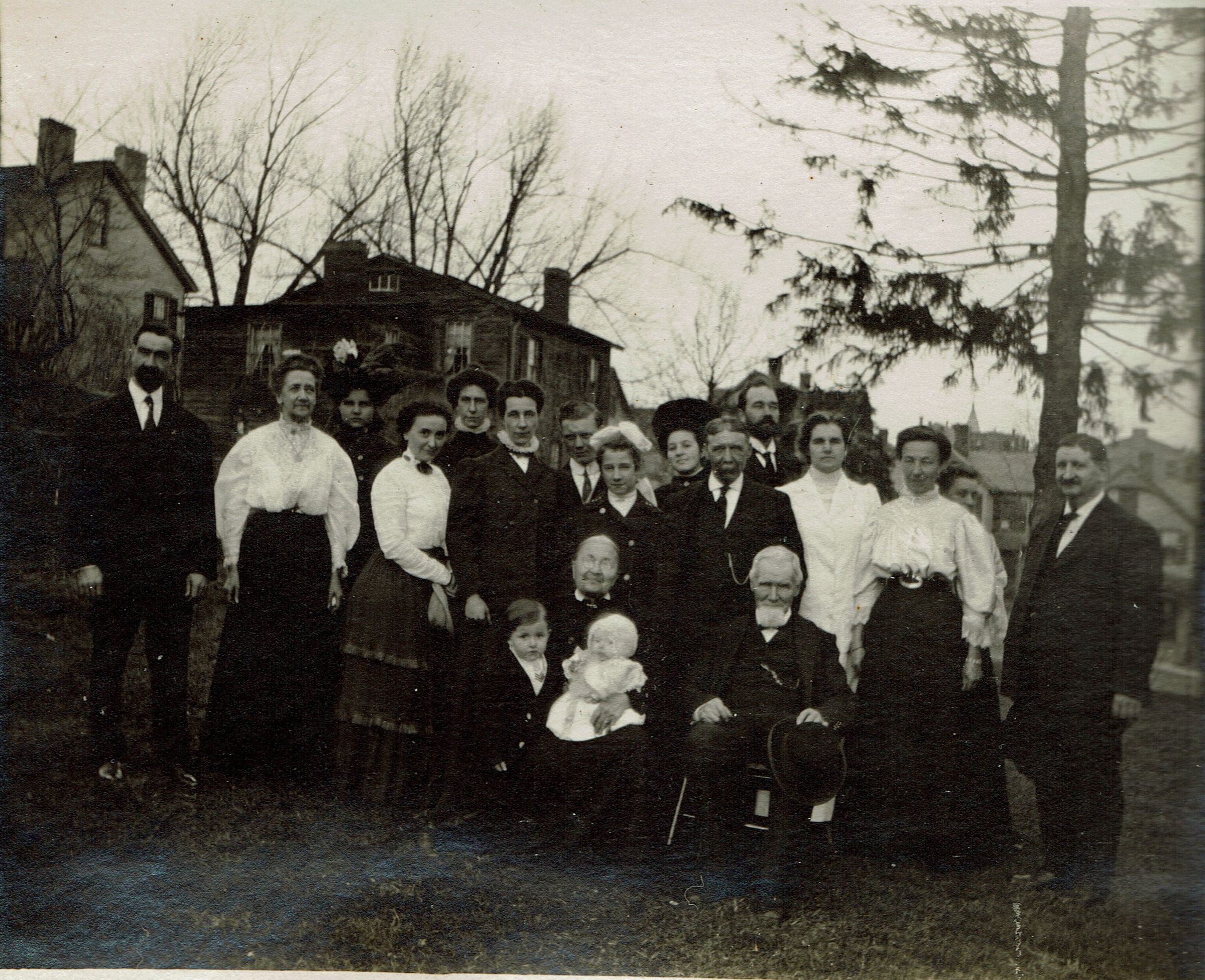 Family photograph taken outdoors. Elizabeth Schmidt-Marshall, Margaret Marshall, Frank Marshall and other family members. Marshall-Schmidt Album, page 45, bottom.Collection
