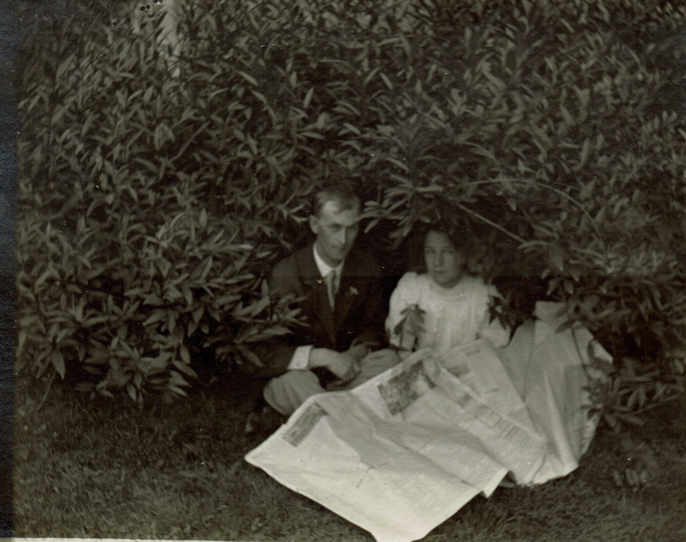 Margaret Marshall and unidentified young man seated under a bush with a newspaper. Page 41, bottom image.Collection