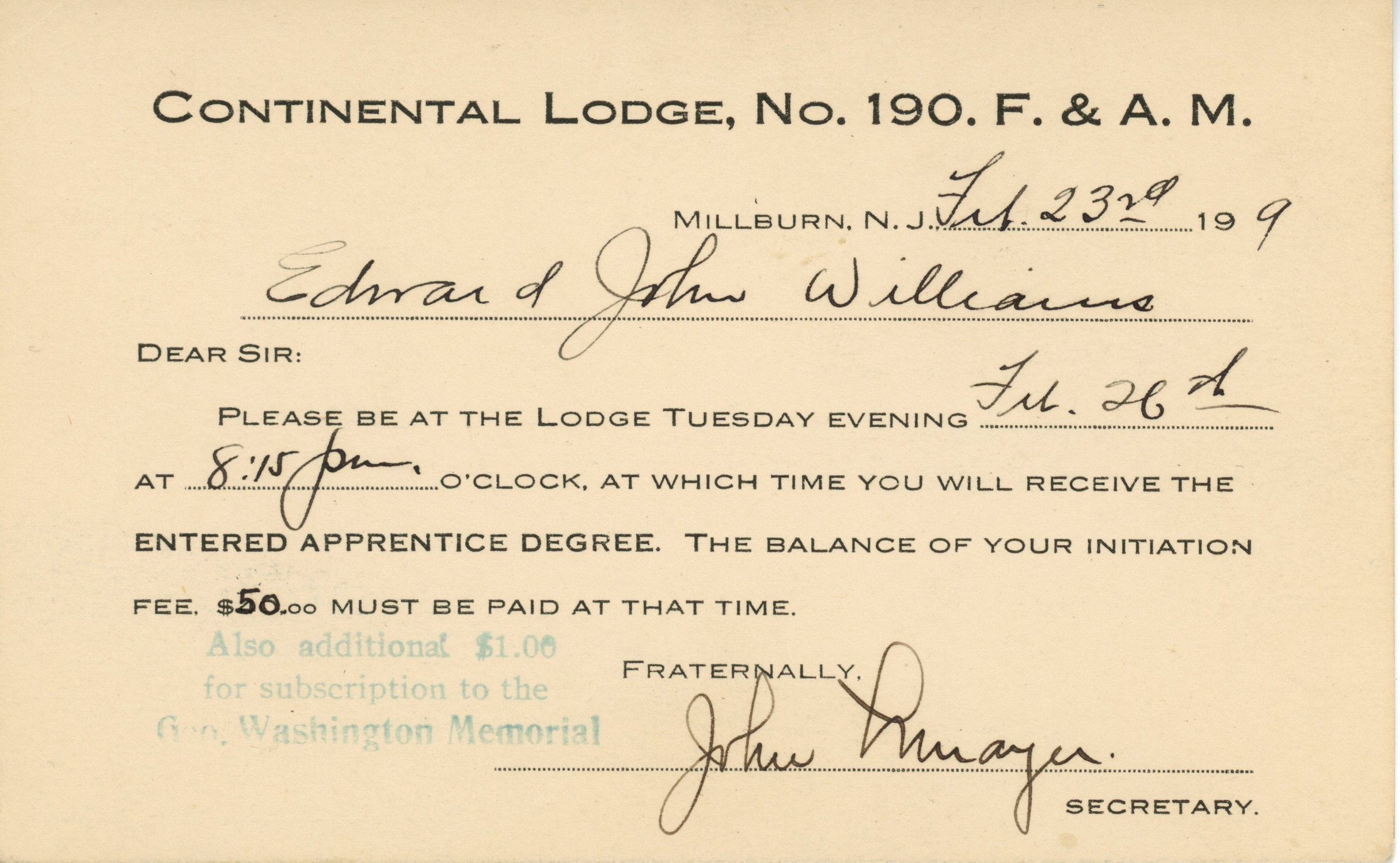Membership card for Edward John Williams into the Continental Lodge, No. 190, F.&A.M, Millburn, N.J. Dated February 23, 1909 (?), requesting Williams to be at the Lodge Tuesday evening February 26 at 8:15 pm to received the entered apprentice degree. The balance of the initiation fee of $50 to be paid at that time. Signed John Mayer, Secretary. Notice that an additional $1.00 for subscription to the George Washington Memorial to be paid.