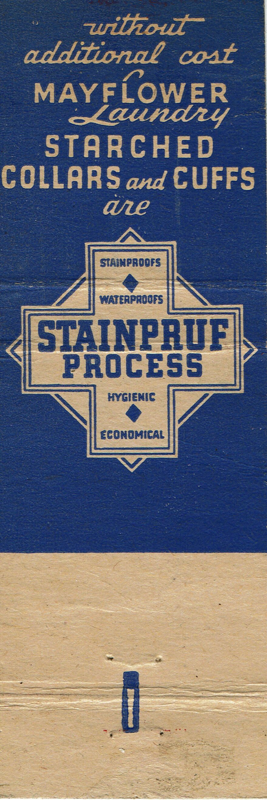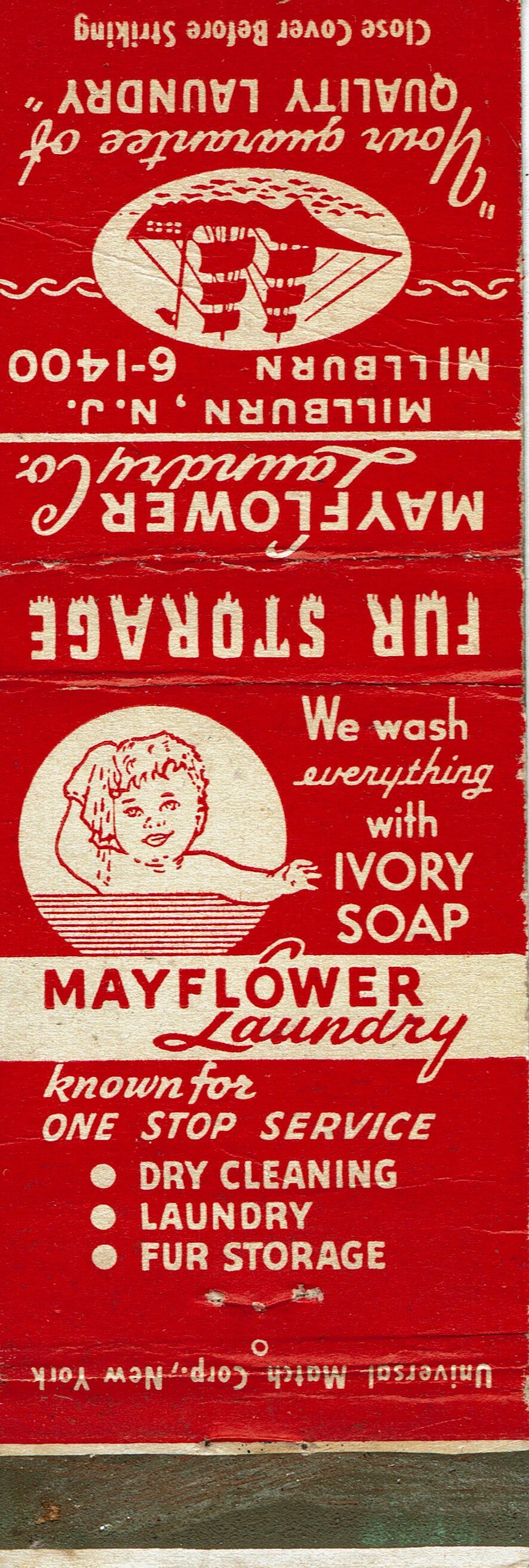 Matchbook cover for Mayflower Laundry, Co., Millburn, NJ. Text reads: "We wash everything with Ivory Soap," "Your guarantee of QUALITY LAUNDRY." Known for one stop service: Dry Cleaning, Laundry, Fur Storage. Interior of matchbook text: "Without additional cost, Mayflower Laundry starched collars and cuffs are "Stainpruf Process." The Laundry was established in c. 1926 and closed in c. 1957-8.Acquisition
