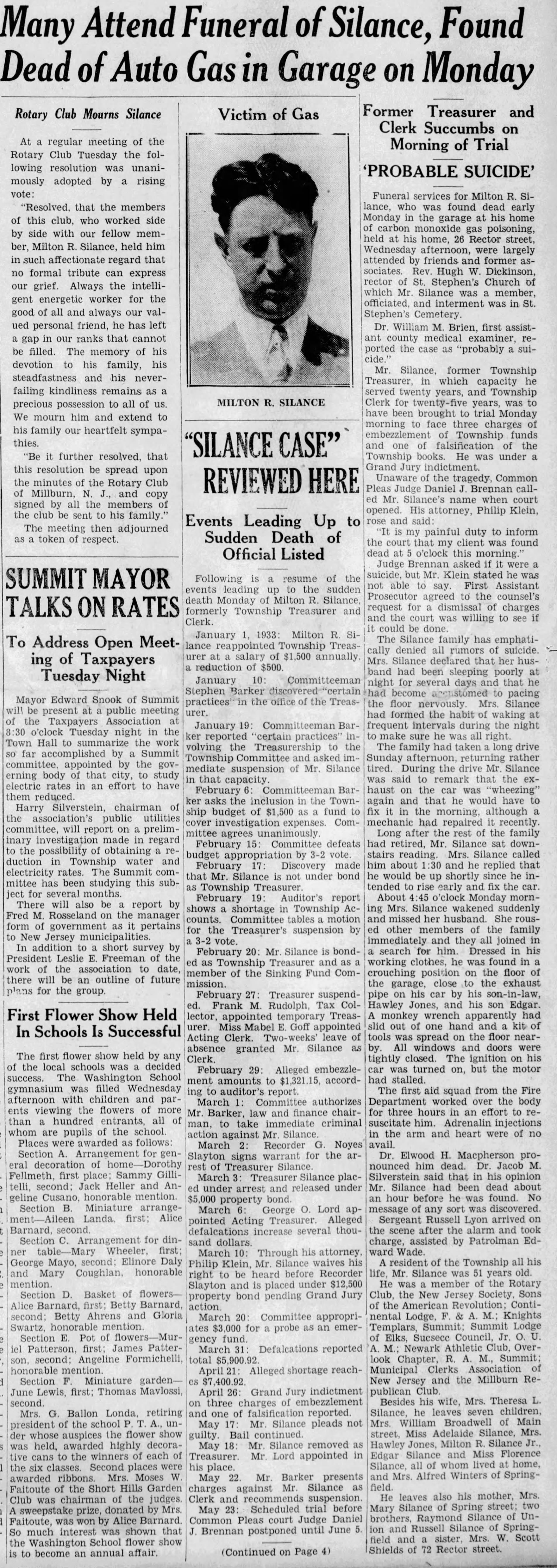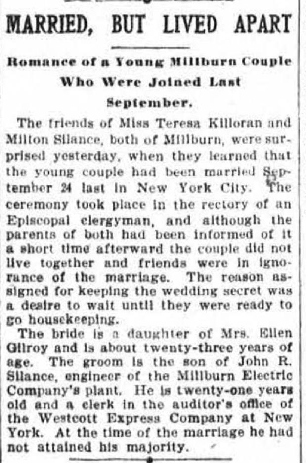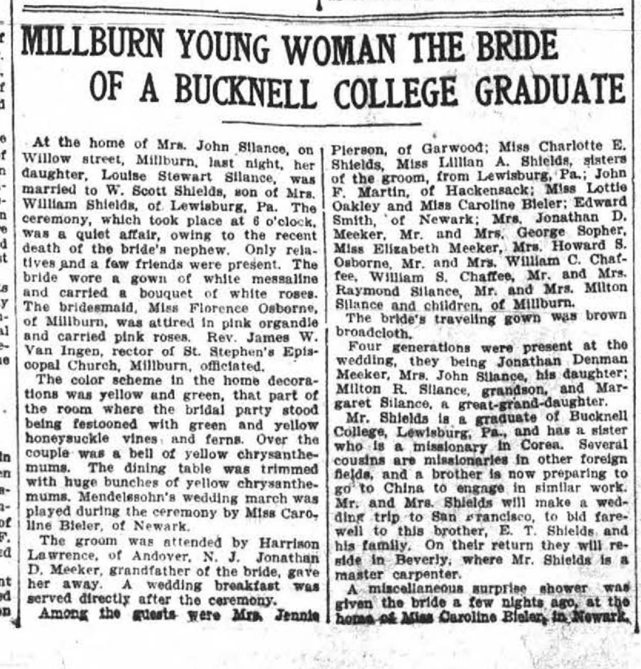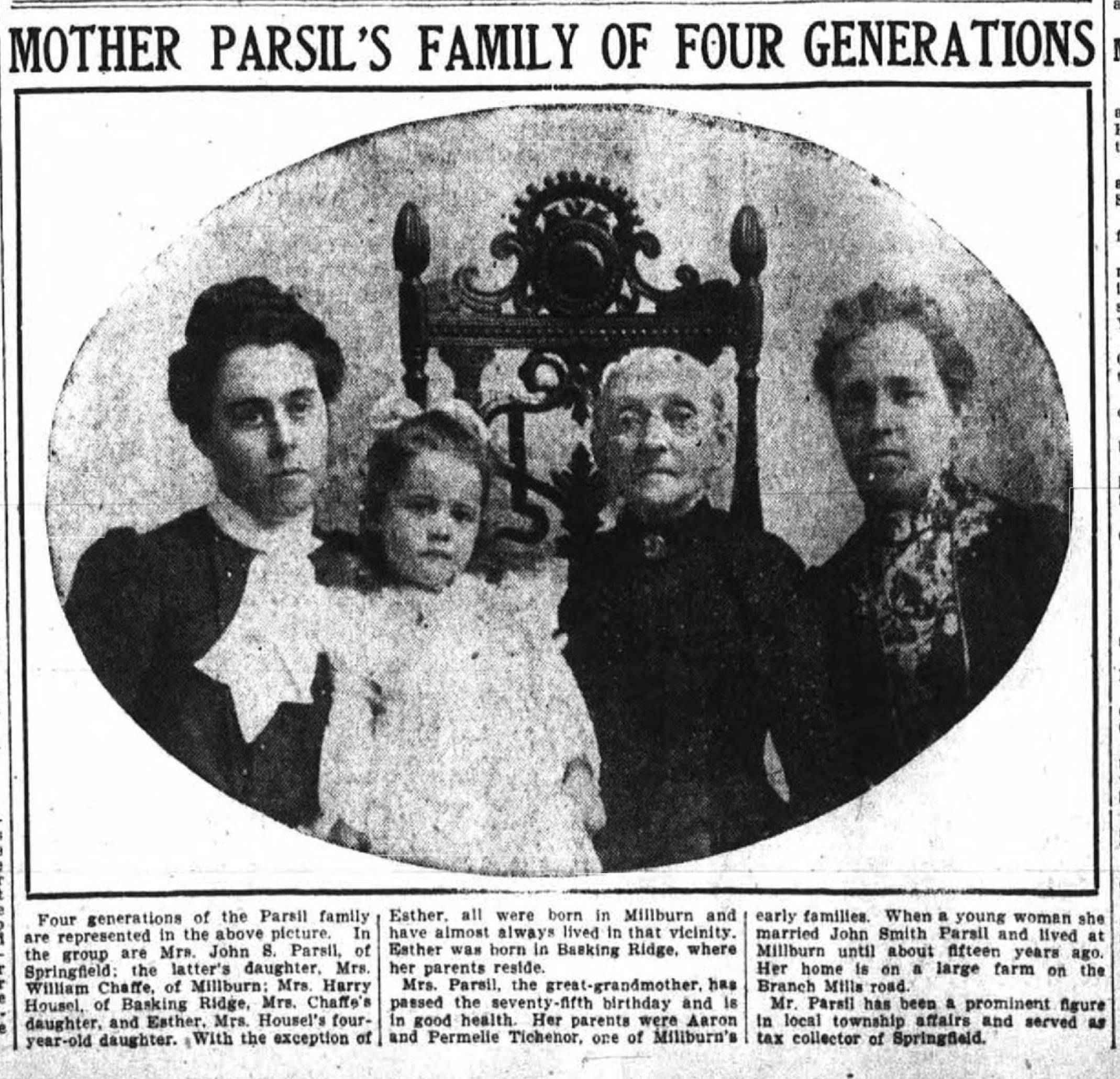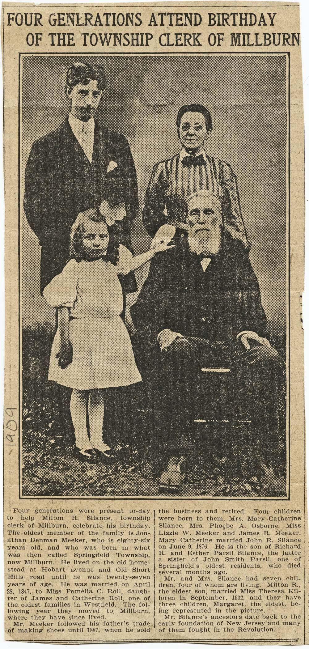 A 1909(?) newspaper article, from an unidentified newspaper, titled "Four Generations Attend Birthday of the Township Clerk of Millburn." Three of the four family members in the photo are identified as Jonathan Denman Meeker, Milton R. Silance, Margaret Killoren, and an unidentified woman. One of the daughters of Jonathan Denman Meeker and Pamelia C. Roll Meeker was Mary Catherine, who married Milton R. Silance, the Millburn Township clerk. Regrettably, in 1933 Milton Silance was indicted for embezzlement and committed suicide a few months later. The article was apparently found in the archives of the Washington Township Historical Society. It is yellowed and fragile. A handwritten penciled note on the left side of the article says "1909," presumably the date of the article, and which the woman's clothing and the little girl's clothing confirms.Acquisition