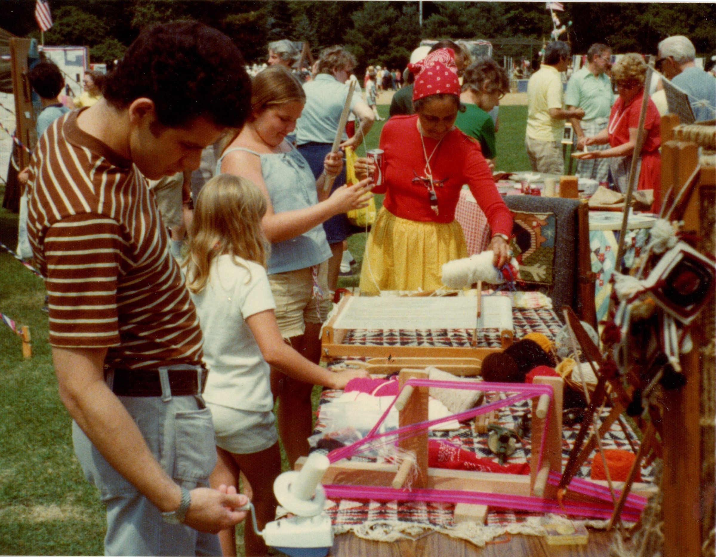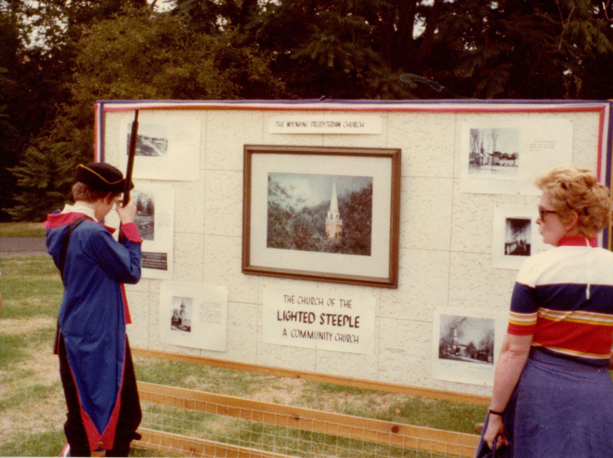 Photographs of the Bicentennial Celebration in Taylor Park on Memorial Day 1976. Quilting Demonstrations, people in period dress, exhibition of the Church of the Lighted Steeple and Community Church.Collection