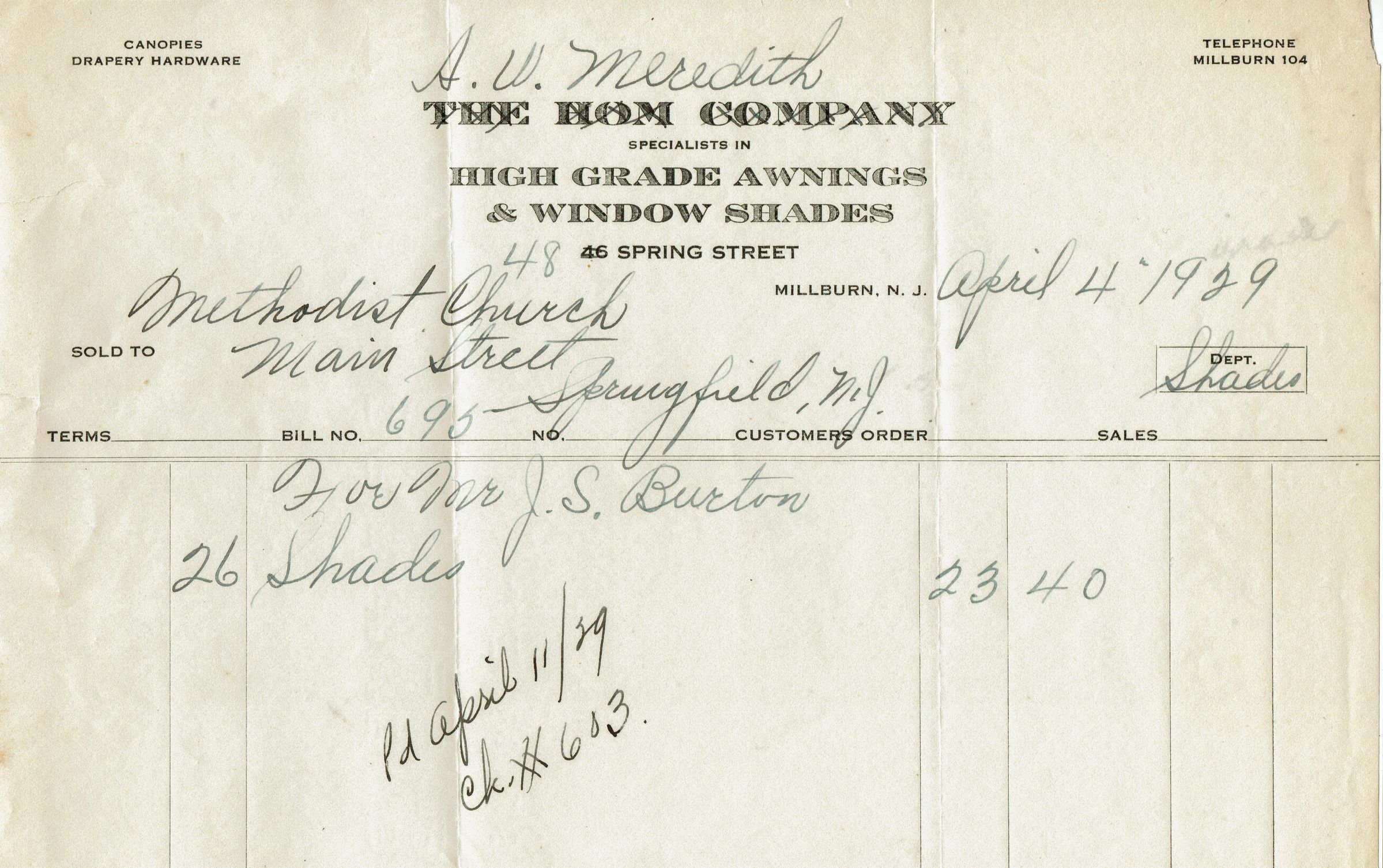 Receipt from Alexander W. Meredith Company for 26 Shades for Mr. J.S. Burton for the Methodist Church, Main Street, Springfield, N.J. dated April 4, 1929. Invoice is written on paper with letter head from The HOM Company specialists in High Grade Awnings and Window Shades, 46 Spring Street, Millburn, NJ. By 1929, Meredith had opened a similar business (perhaps taking over the HOM Company) at 48 Spring Street, Millburn. Meredith would remain in business at that location until the 1950s.Acquisition