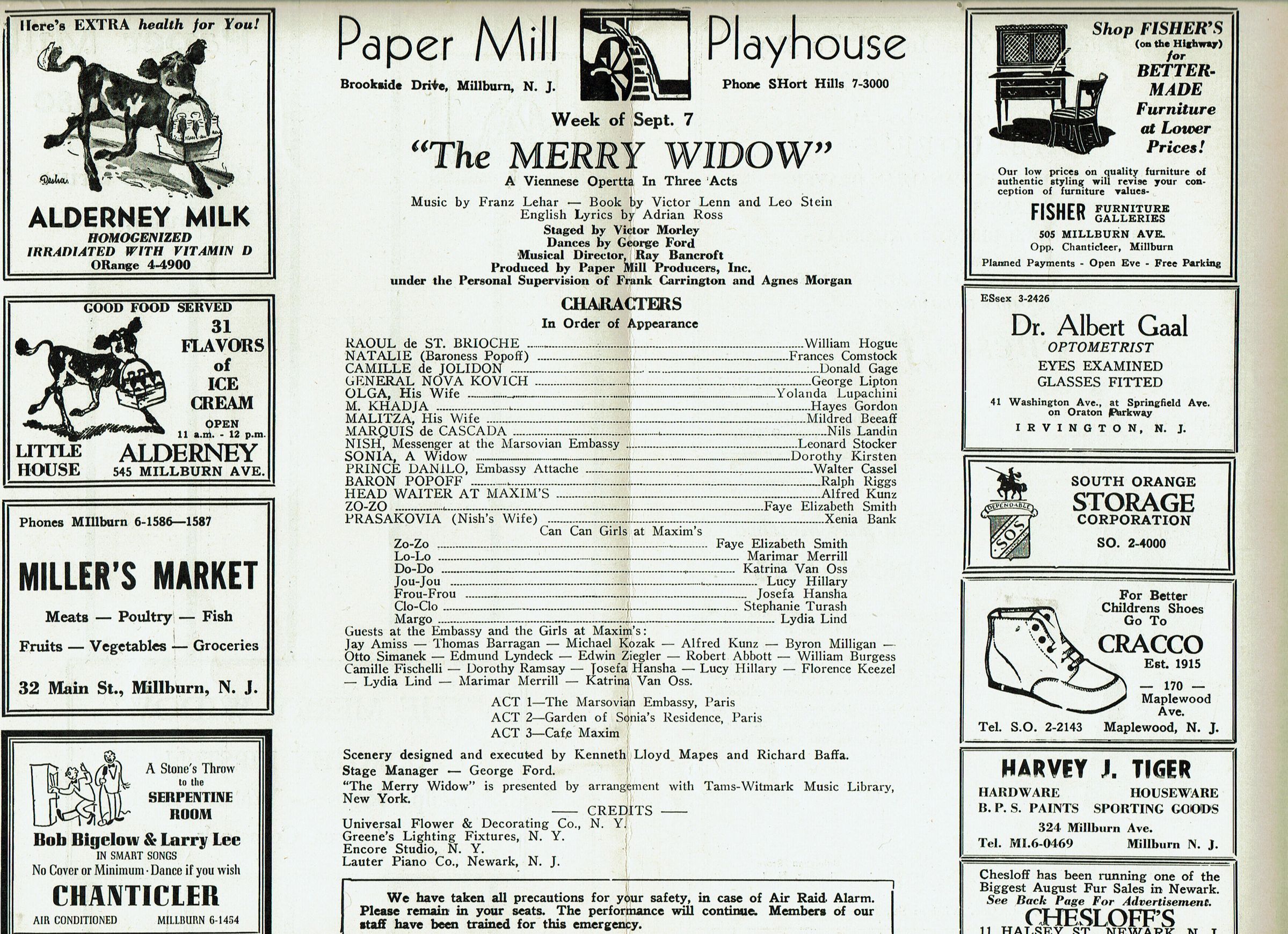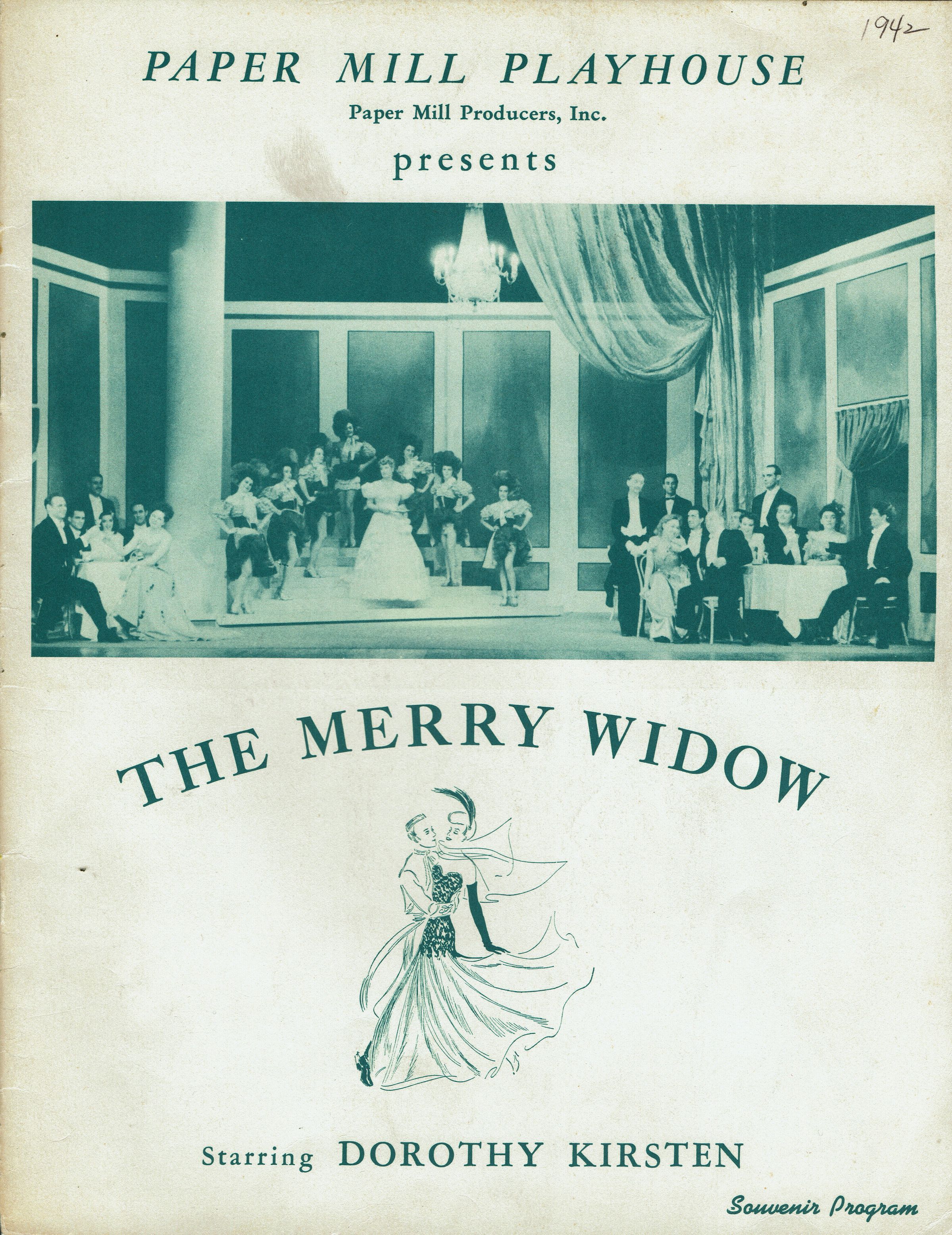 Souvenir Program for 1942 Paper Mill Playhouse Production of "The Merry Widow" with Dorothy Kirsten. Deluxe fully illustrated program with photographs and articles about Paper Mill Playhouse. 20 pp. (Unpaginated). 4 page program included. Illustrated with advertisements for local businesses.Collection