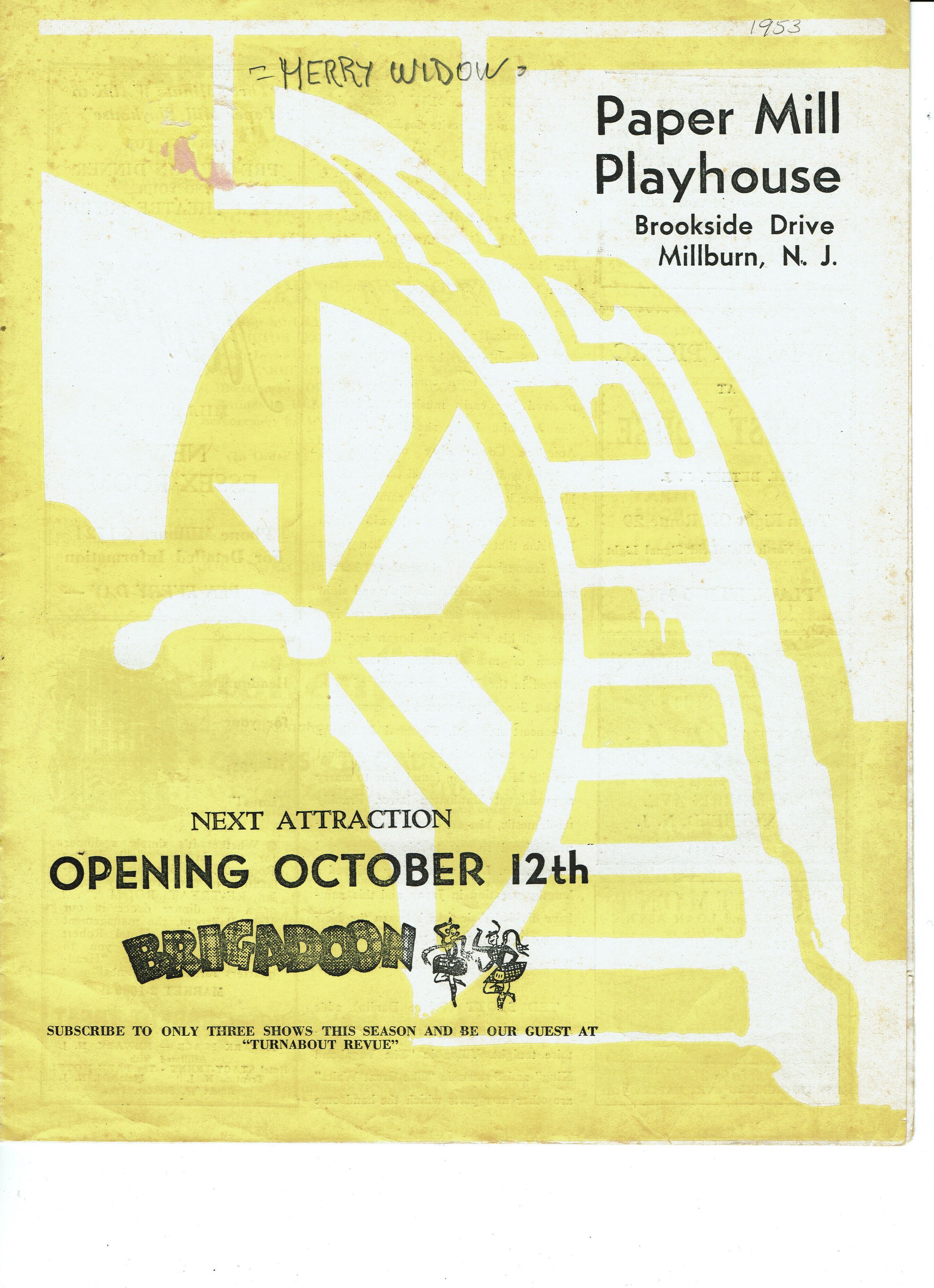 Paper Mill Playhouse Program for The Merry Widow, week starting December 8, 1953 with Ted Scott and Dorothy Sandlin. 10-page program with cast and production information. Extensively illustrated with B&W area advertisements.Collection