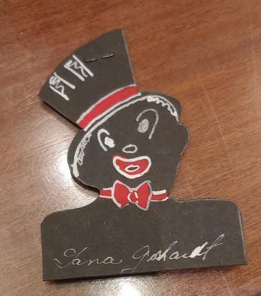 illustration on black paper. Later cut into the shape of a person. small folded piece stapled on back so that it can stand.Acquisition