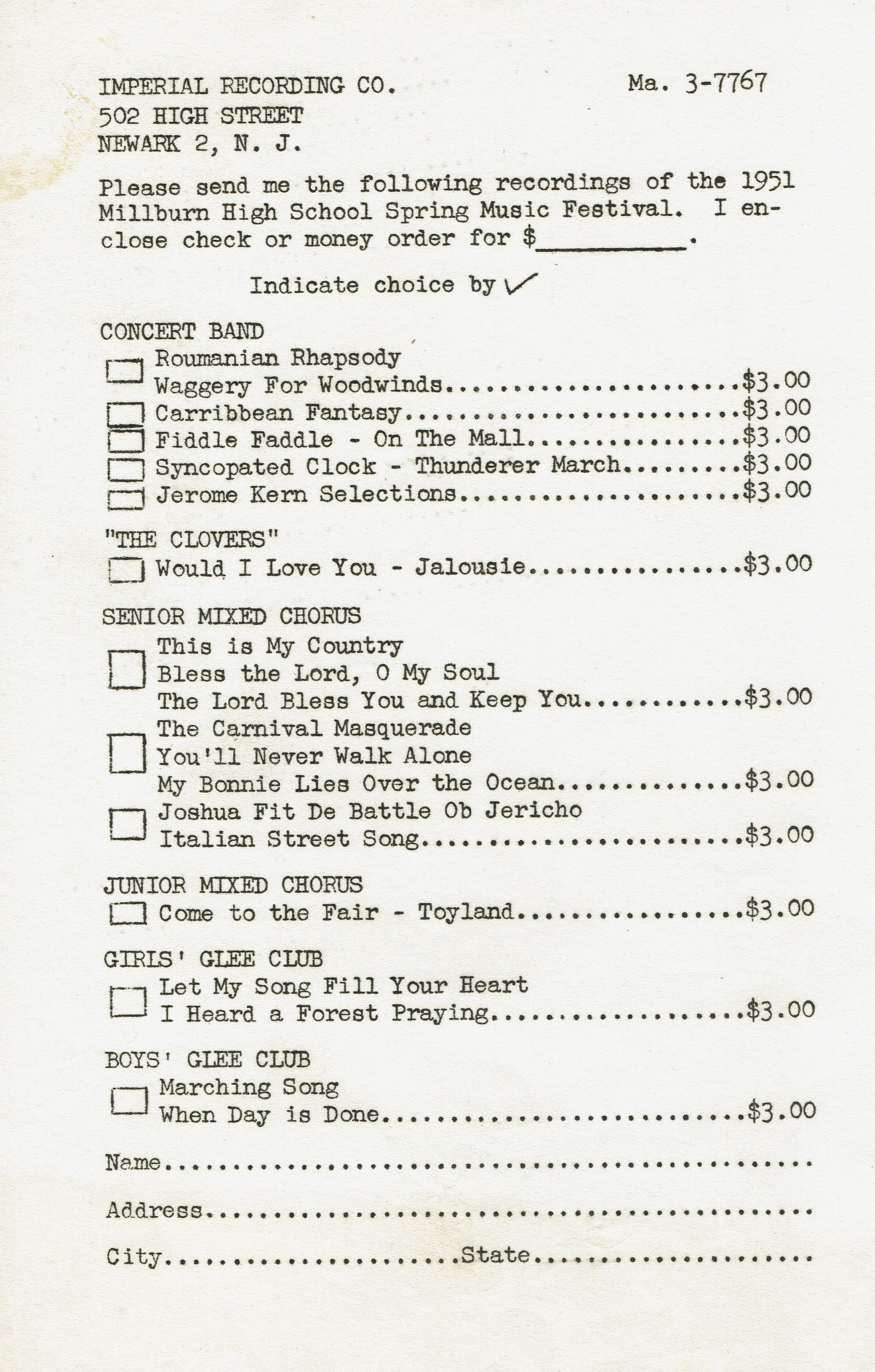 Order form to request recordings of music from the 1951 Millburn High School Spring Music Festival from Imperial Recording Company, 502 High Street, Newark, NJ.Acquisition