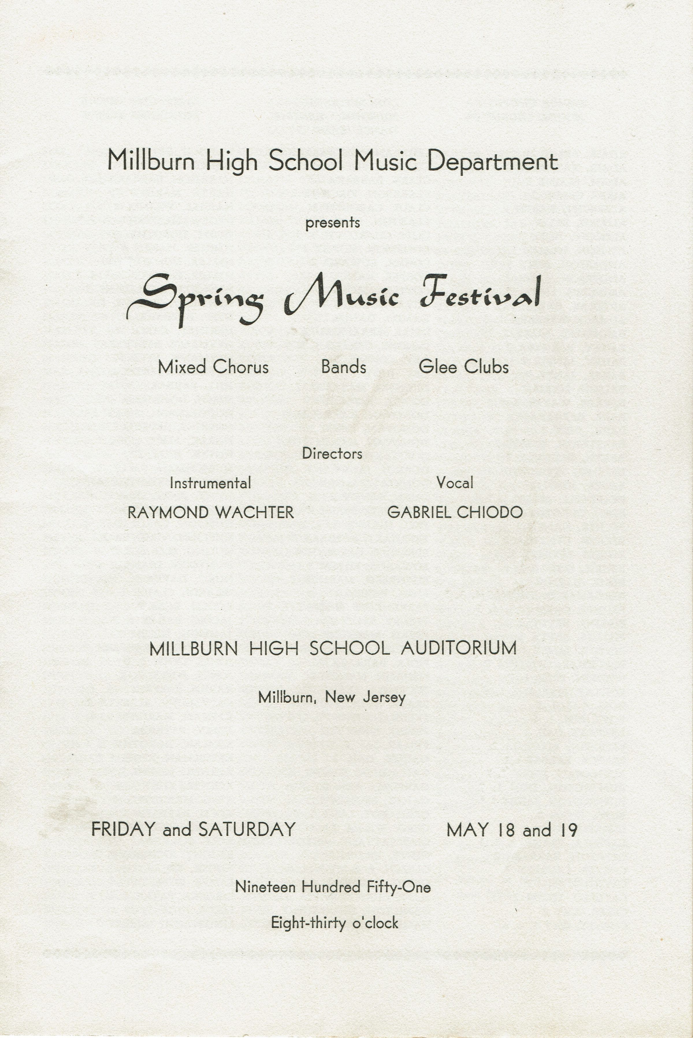 Millburn High School Music Department Spring Music Festival Program, Friday and Saturday, May 18 and 19, 1951, 8:30 pm at the Millburn High School Auditorium. Instrumental Director Raymond Wachter, Vocal Director Gabriel Chiodo. Mixed Chorus, Bands, Glee Clubs. Stapled program with names of performers and contributors.Acquisition