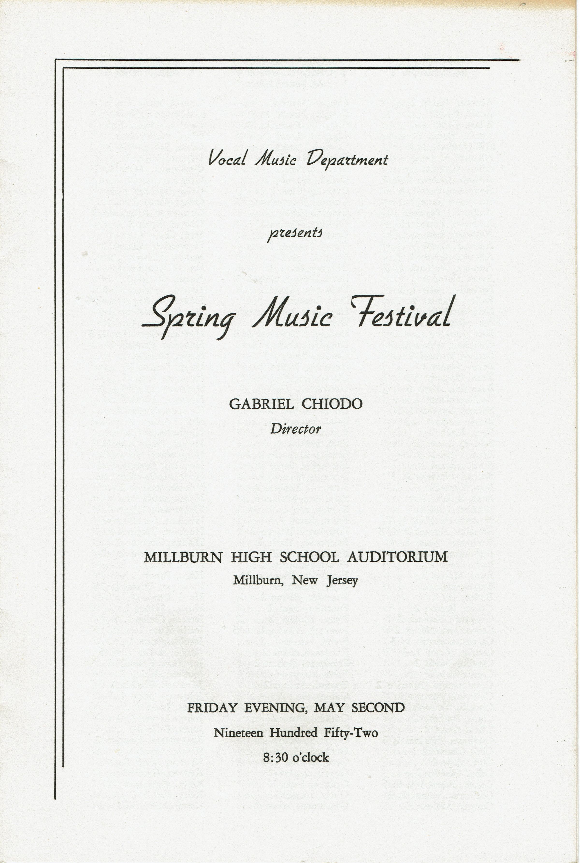 Millburn High School Vocal Music Department Spring Music Festival Program, Friday, May 2, 1952, 8:30 pm at the Millburn High School Auditorium. Vocal Director Gabriel Chiodo. Mixed Chorus, Millburnaires, Stardusters, Glee Clubs. Stapled program with names of performers and contributors.Acquisition
