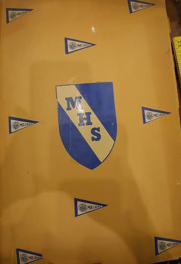 decorated with millburn high school banners and stickers
