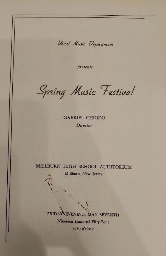 Millburn High School Vocal Music Department Spring Music Festival Program, Friday, May 7, 1954, 8:30 pm at the Millburn High School Auditorium. Vocal Director Gabriel Chiodo. Mixed Chorus, Millburnaires, Melodettes, Glee Clubs. Dischords. Stapled program with names of performers and contributors.Acquisition