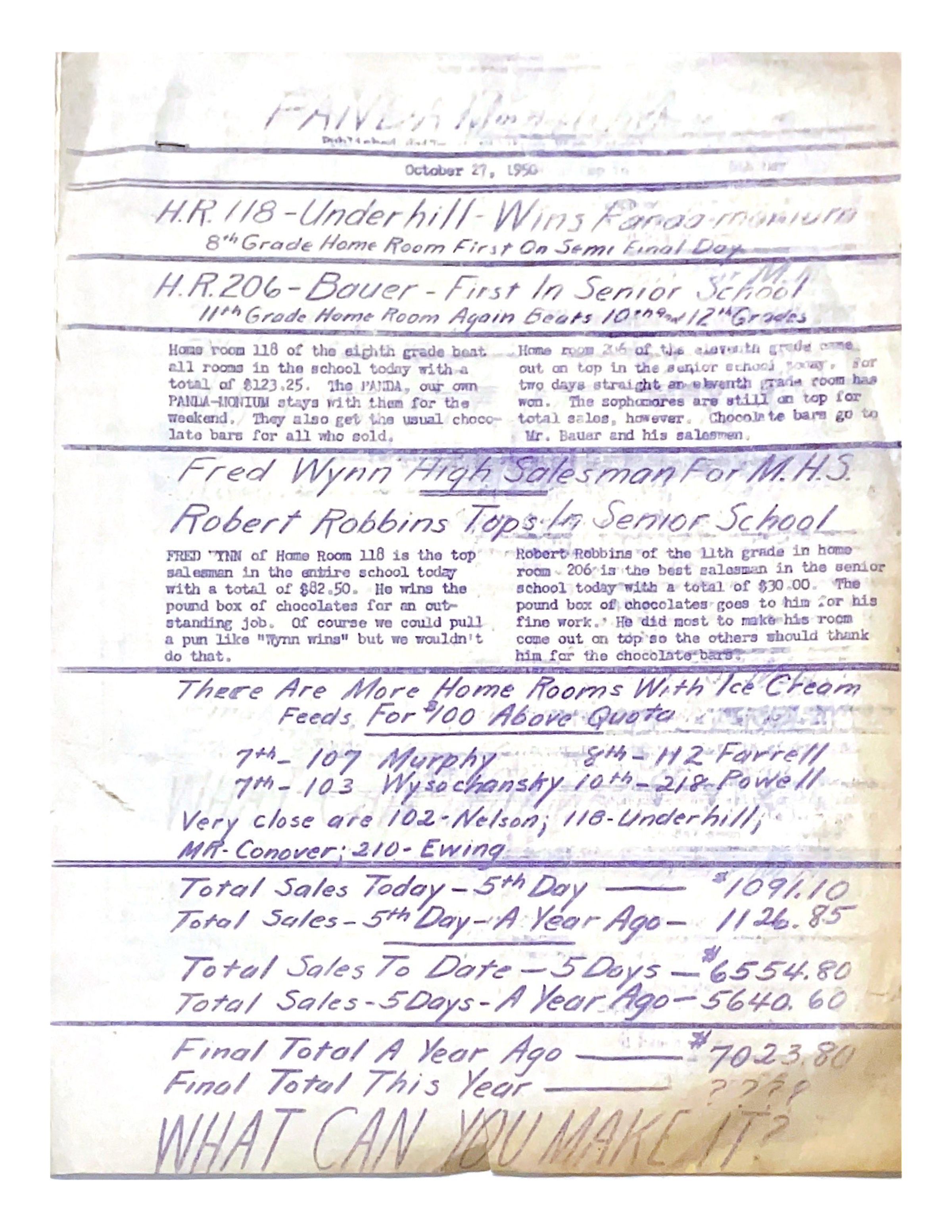 Newsletter from October 27, 1950 that details sales during a fundraising event named Panda-Monium at the Junior and Senior High Schools.Acquisition
