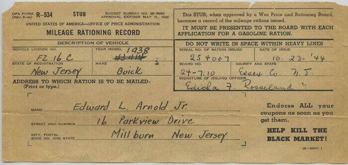 Mileage rationing record from WWII. Handwritten name of ownder and address are "Edward L. Arnold Jr.; 16 Parkview Dr.; Millburn NJ." Also, handwritten license plate no. and make of car are "FZ16C; '38 Buick." 10/23/1944 was the date of issue. Serial number of Ration issued was 254007 and it was issued by Edith a? Z.? Rosseland. It has small tears along top edge. RIght and left corners are ripped. Yellowing near corners. On back, there are no entries.Acquisition