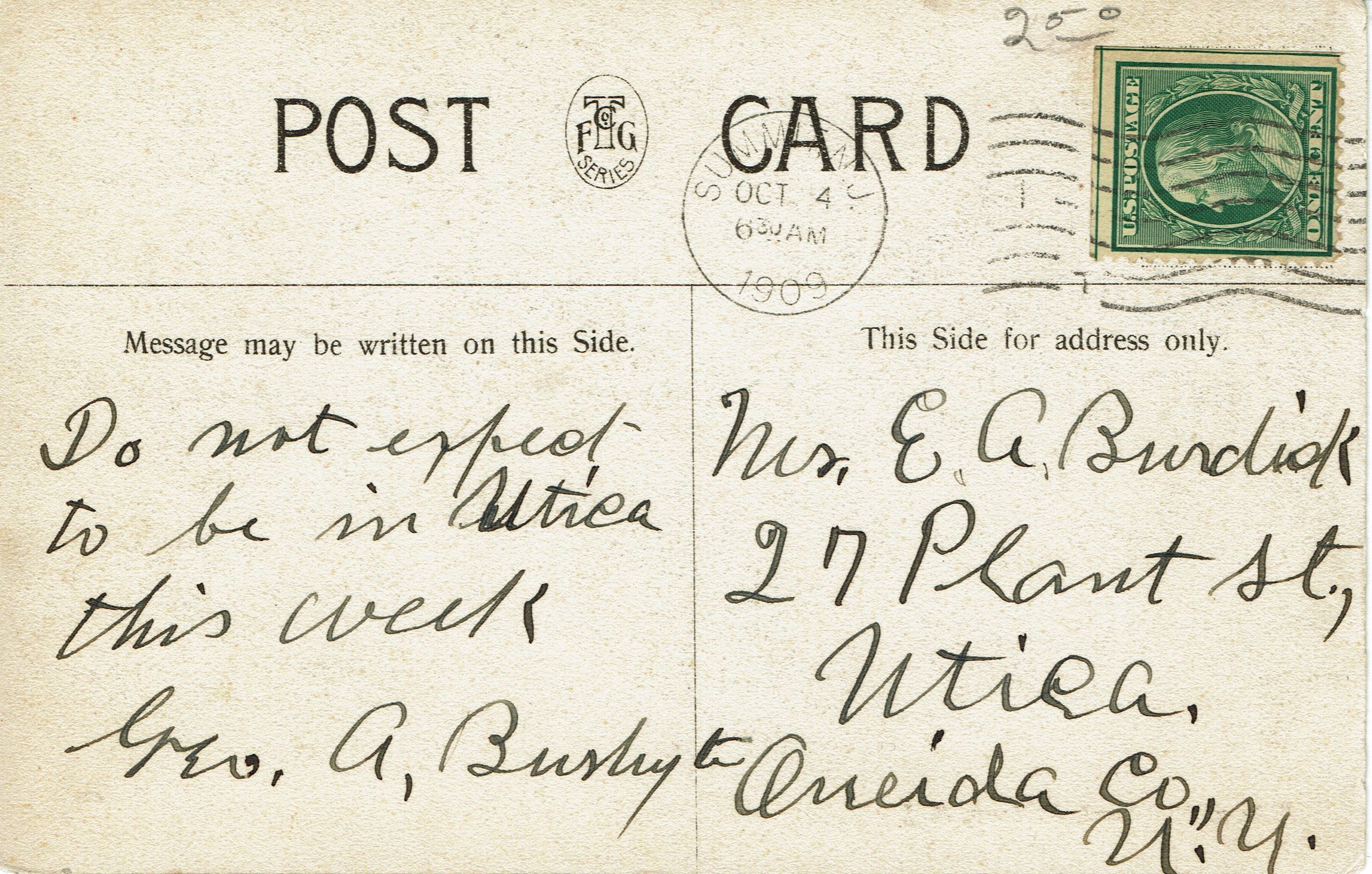 These are the falls to the Lighthipe Pond from the Lighthipe factory. Postally used, postmarked Summit, October 4, 1909, 6:30 am. Addressed to Mr. E.A.Burdisk, 27 Plant Street, Utica, Oneida County, NY.Collection
