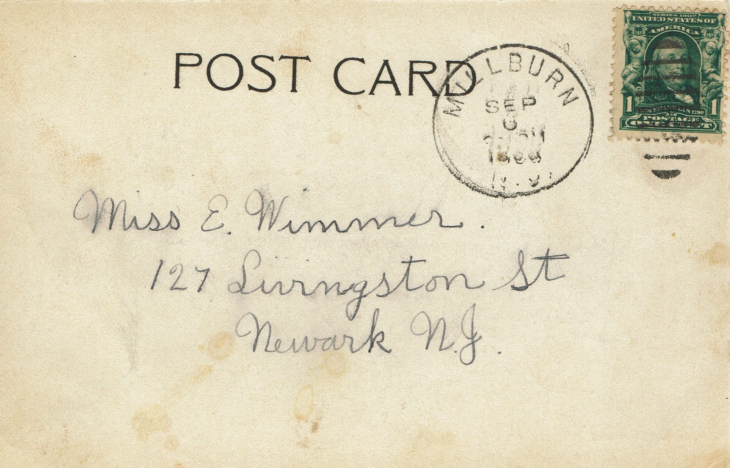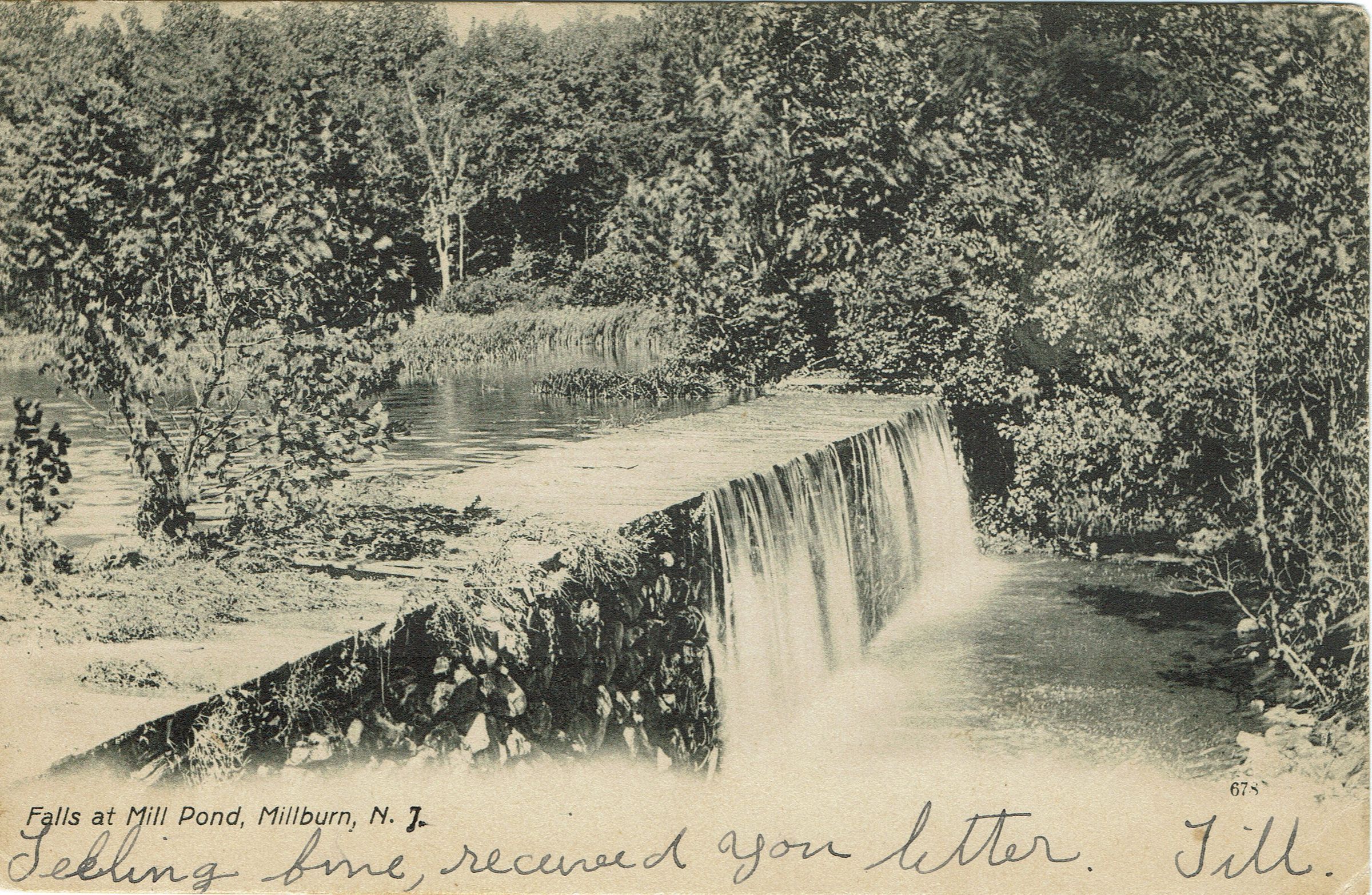 Postally used B&W postcard of the Falls at Mill Pond, Millburn, N.J. These are the falls to the Lighthipe Pond from the Lighthipe factory. The pond is now filled in and the site is the athletic fields for the Millburn Middle School. Message on front reads "Feeling fine, received you (sic) letter. Till (Tilly Wimmer)." Postmarked Millburn, September 6, 1906 (?) and addressed to Miss E. Wimmer 127 Livingston street, Newark, NJ.Collection