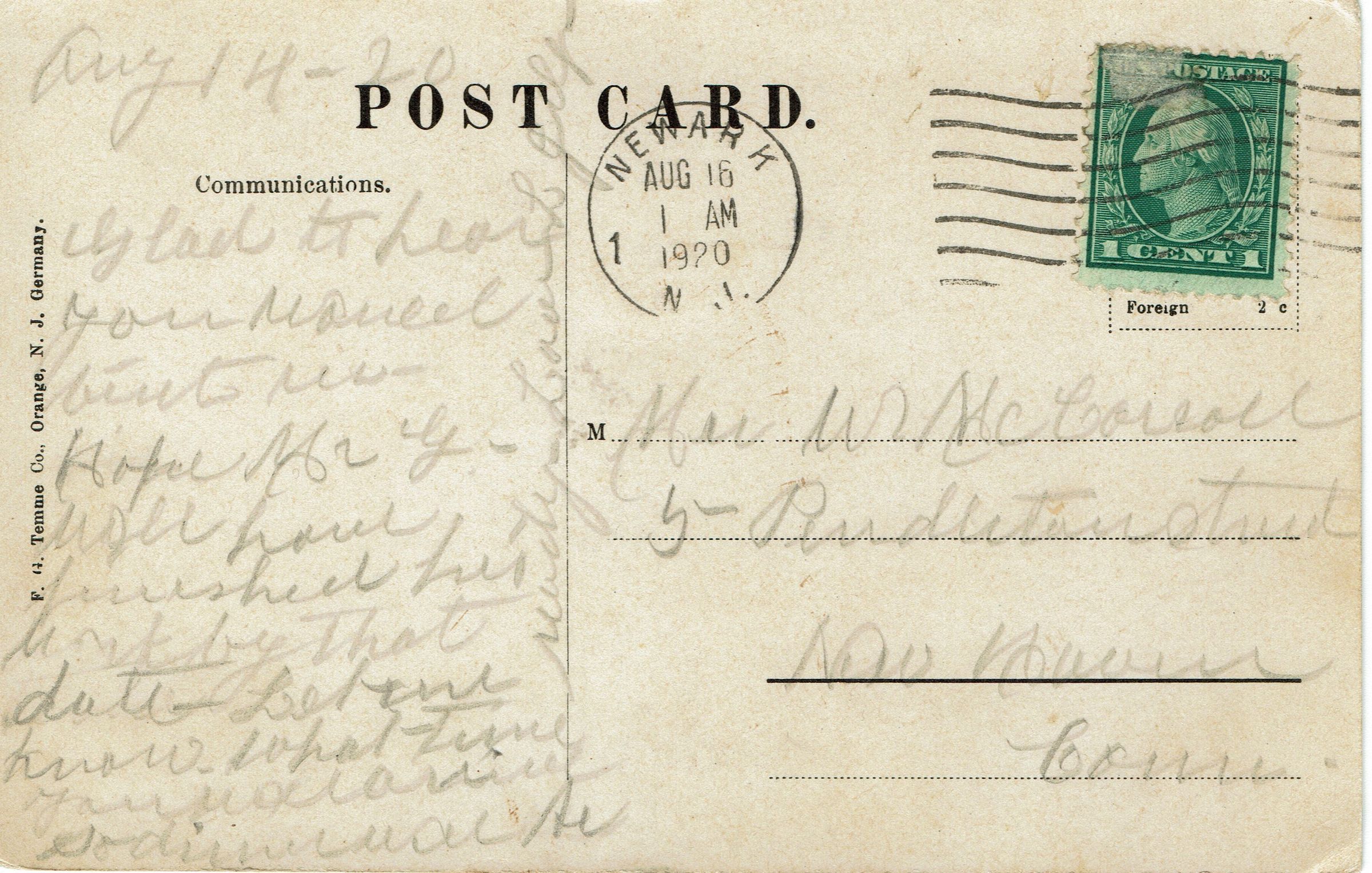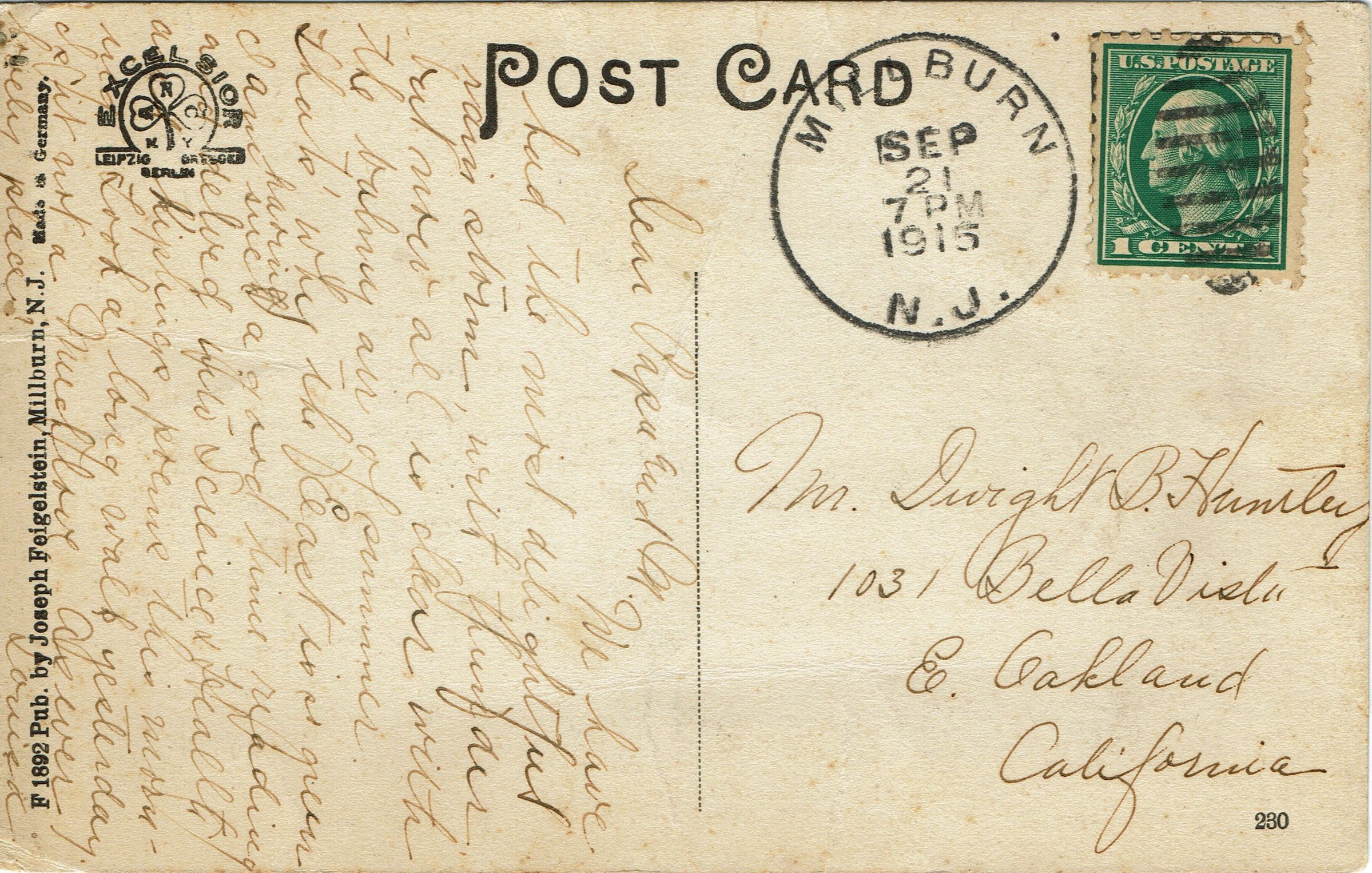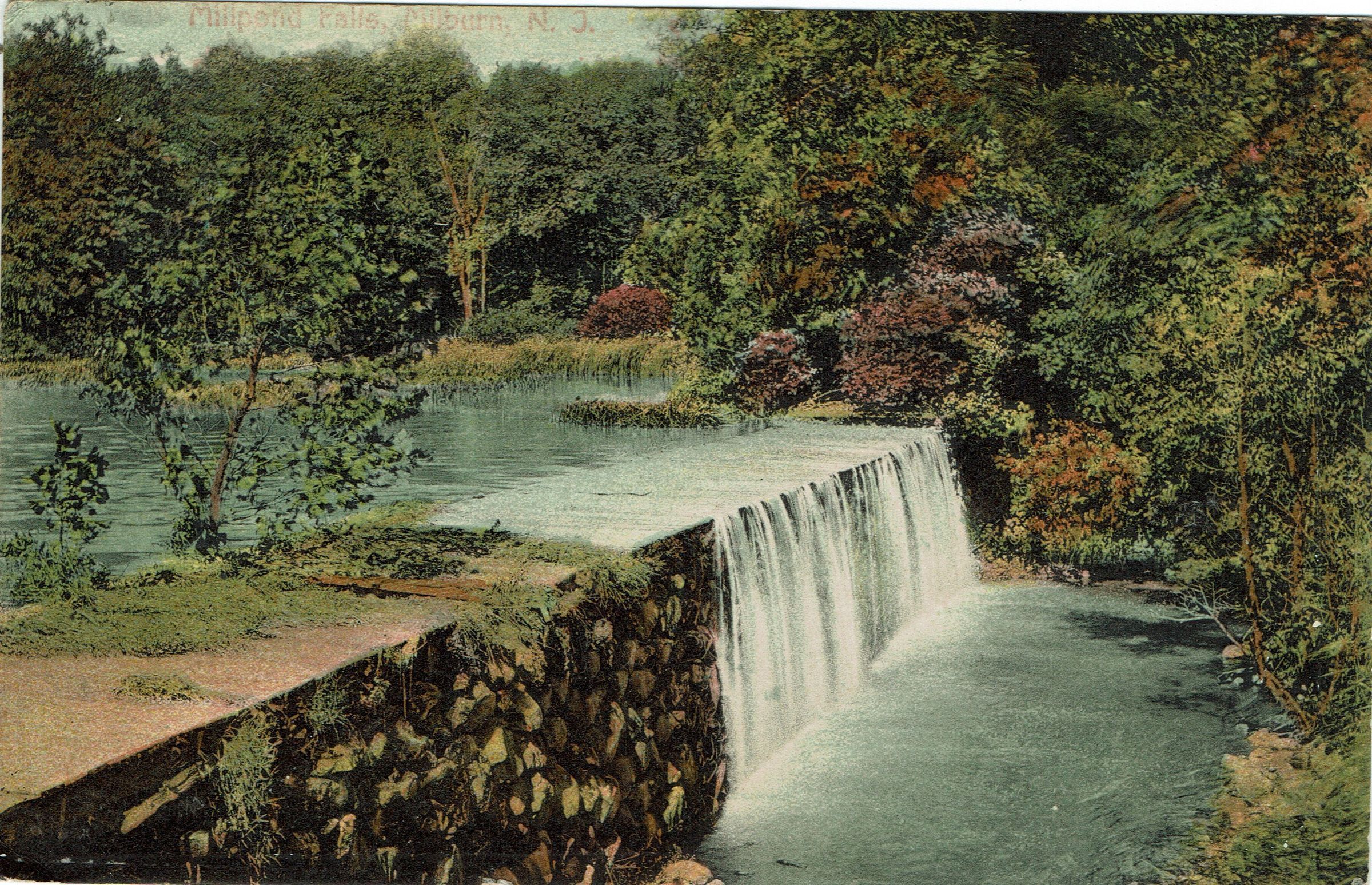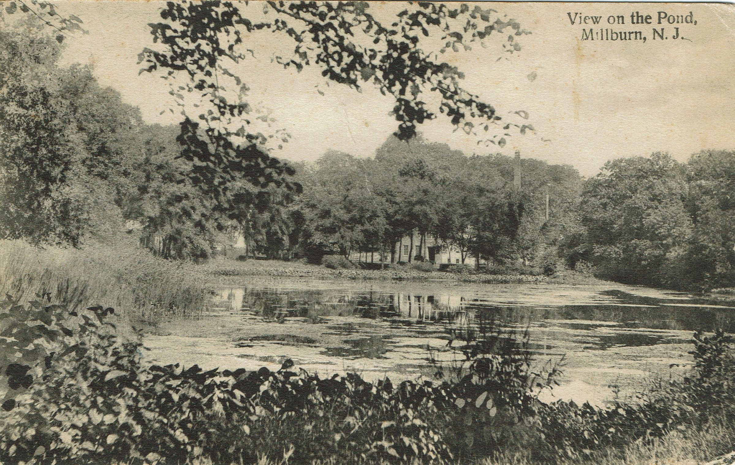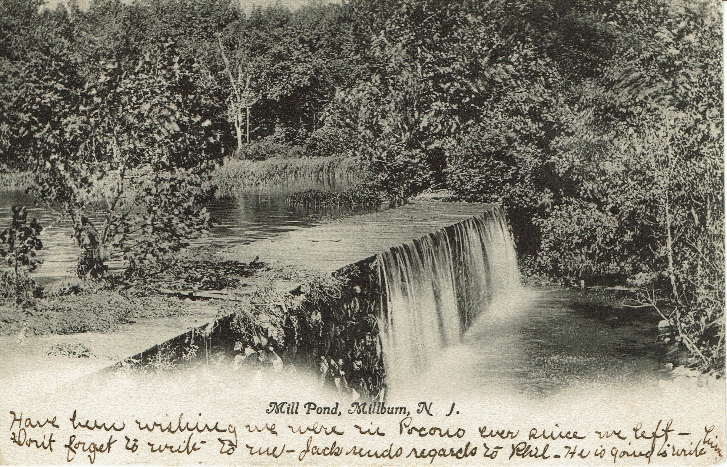 Three postally used postcards of the Old Mill Pond and the Falls. Multiple copies in the collection. 1. B&W photographic postcard titled "Mill Pond, Millburn, N.J.", postmarked Millburn, September 30, 1905; 2. B&W Photographic postcard entitled "View on the Pond," postmarked September 21, 1915, 3. Color postcard entitled "Millpond Falls, Millburn, N.J." postmarked Newark, August 16, 1920.Collection
