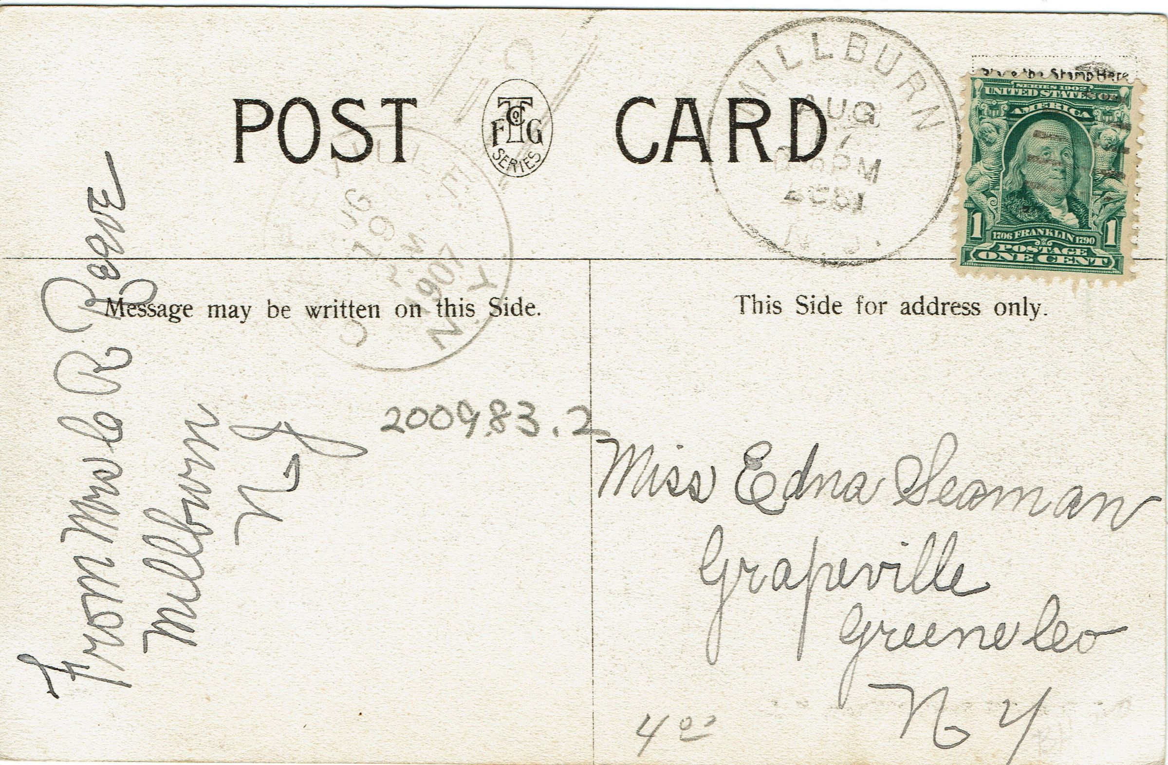 These are the falls to the Lighthipe Pond from the Lighthipe factory. From Mrs. C.R. Reeve, Millburn, NJ to Miss Edna Seaman, Grapeville, NY. Postmarked August 19, 1907.Acquisition