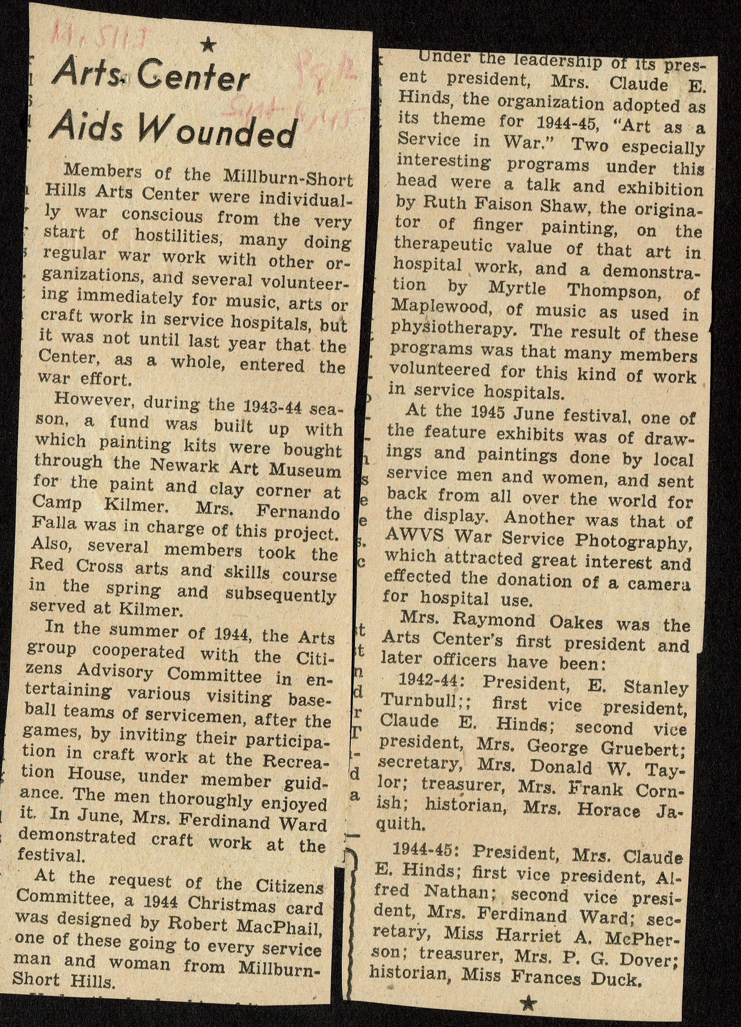 Millburn Art Center 1945 Scrapbook: "Art as a Service in War" article, 1945