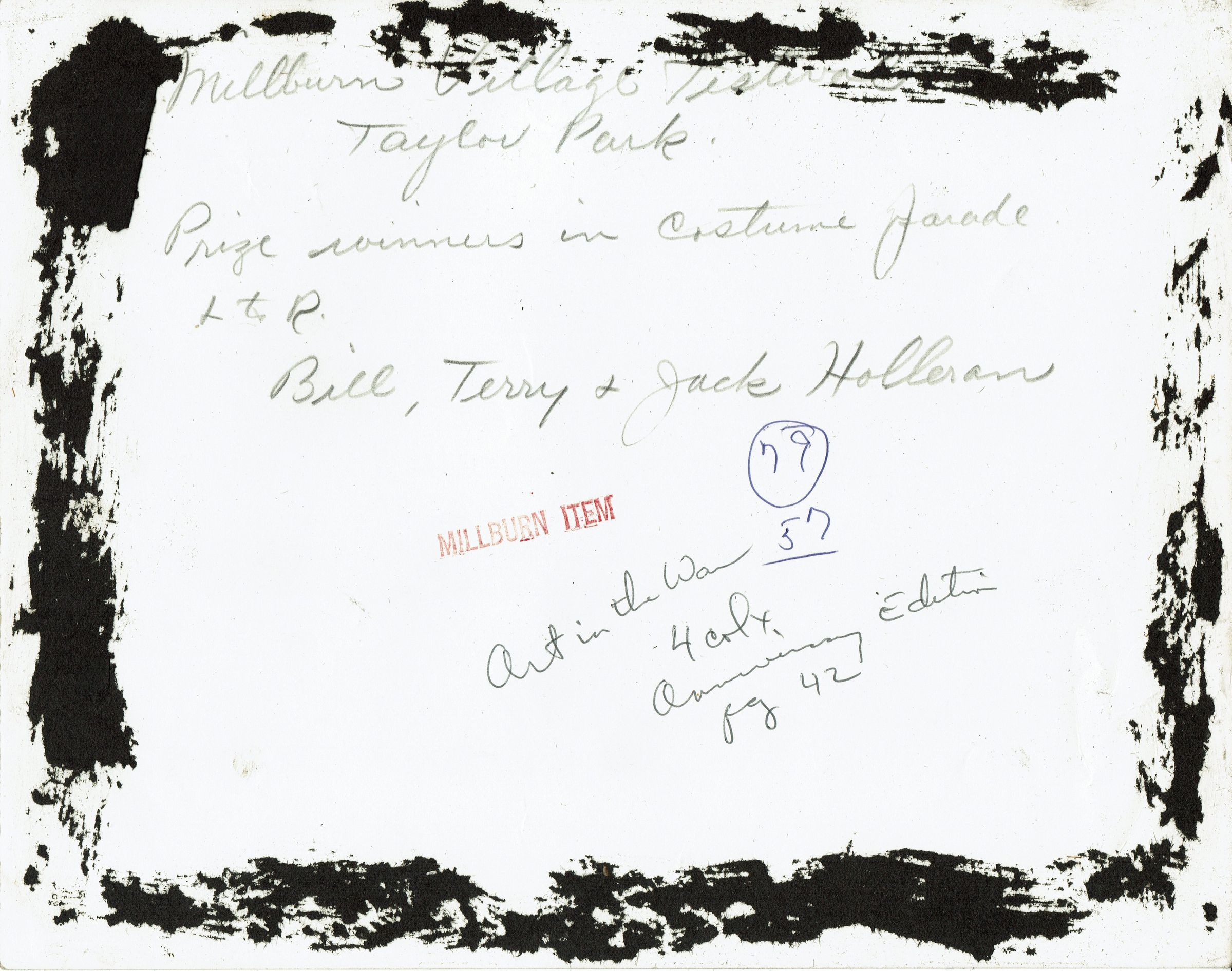 Handwritten inscription on verso of photograph reads: Prize winners in costume parade (L to R): Bill, Terry and Jack Holleran. Photograph was taken at the costume parade and contest at the second annual Village Arts Festival, sponsored by the Millburn Art Center, held in Taylor Park, June 2, 1945.Collection
