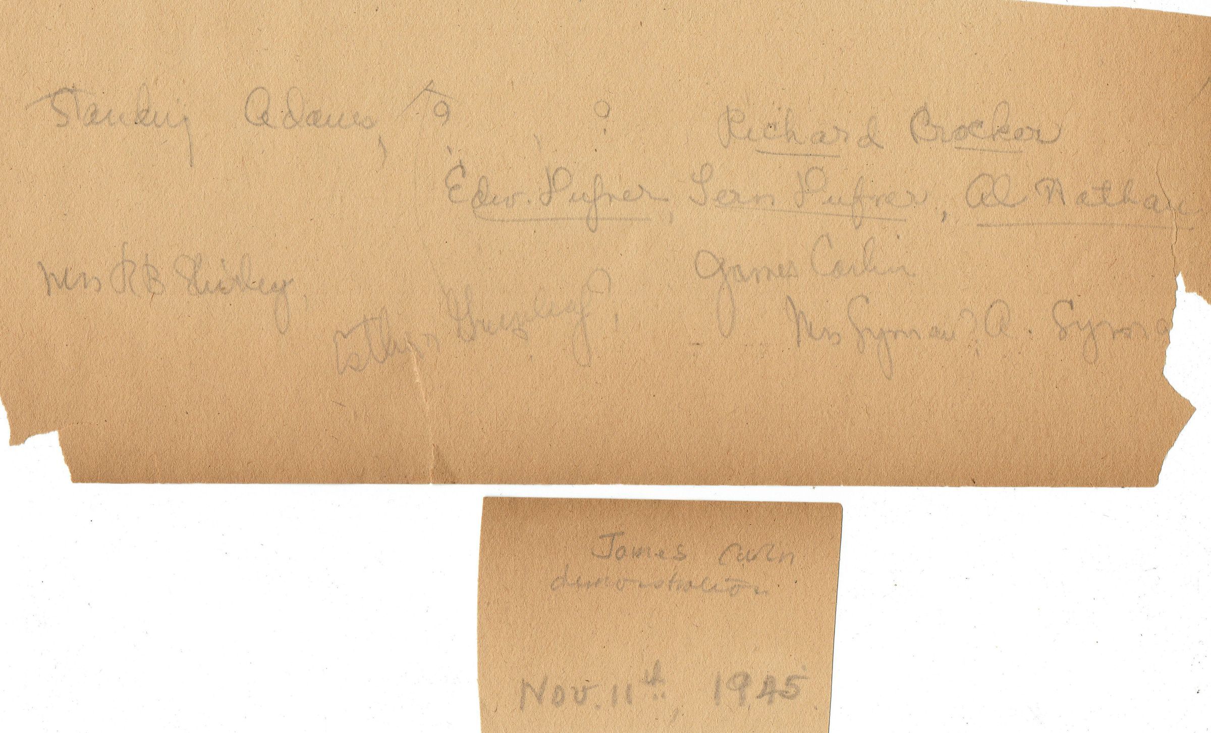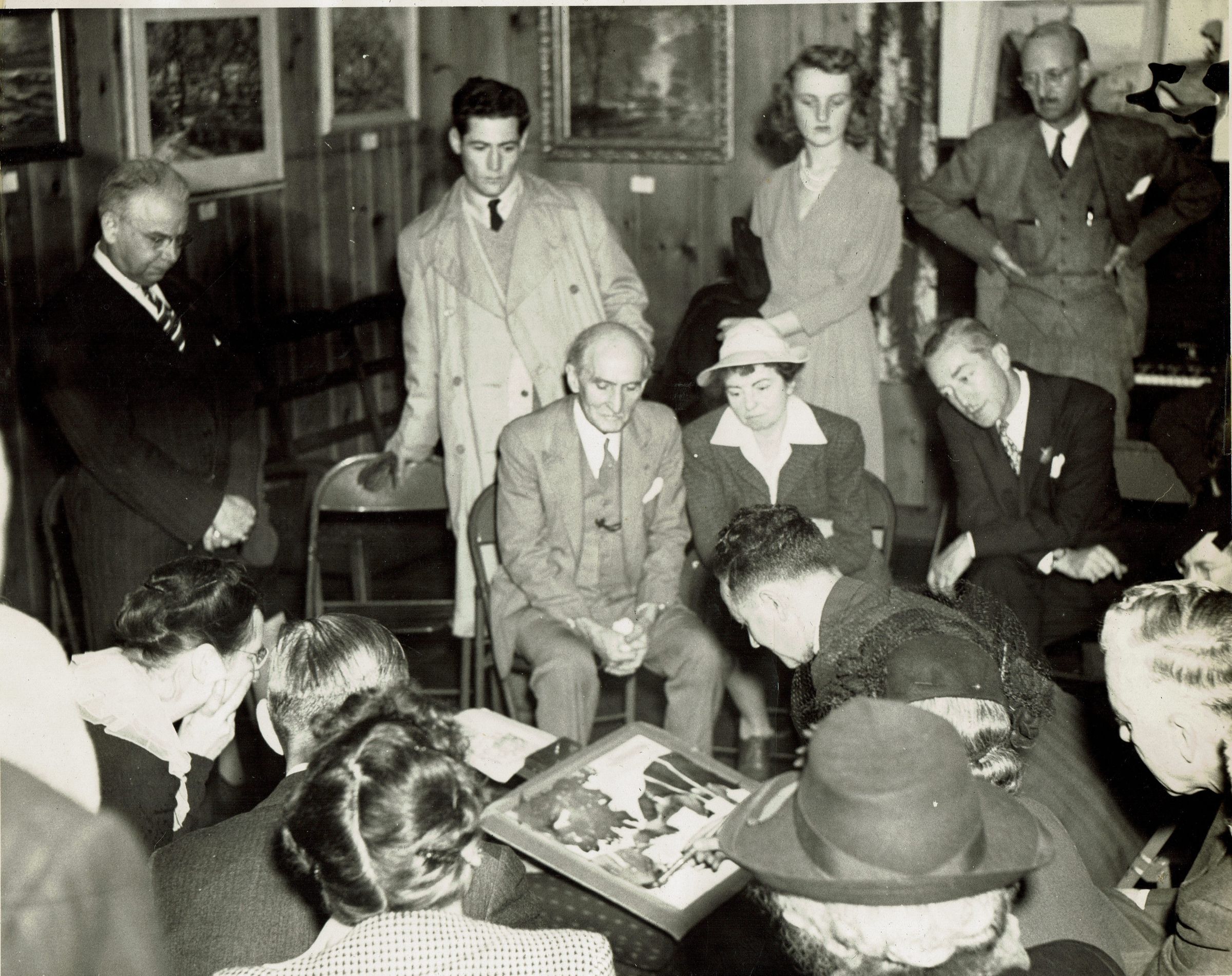 Photograph from the Millburn Art Center 1945 Scrapbook of the November 11, 1945 watercolor demonstration by James Carlin held at the Recreation House in Taylor Park. The event was sponsored by the Millburn Art Center. Among those identified in the photograph are: Wayman Adams & Richard Crocker (Standing), Edward Dufner, Fern Dufner, Alfred Nathan (Seated facing the camera), James Carlin (Seated and working on the painting). Mrs. R. B. Shirley, Esther Greenleaf, Mrs. Seymour A. Sy (?).Collection