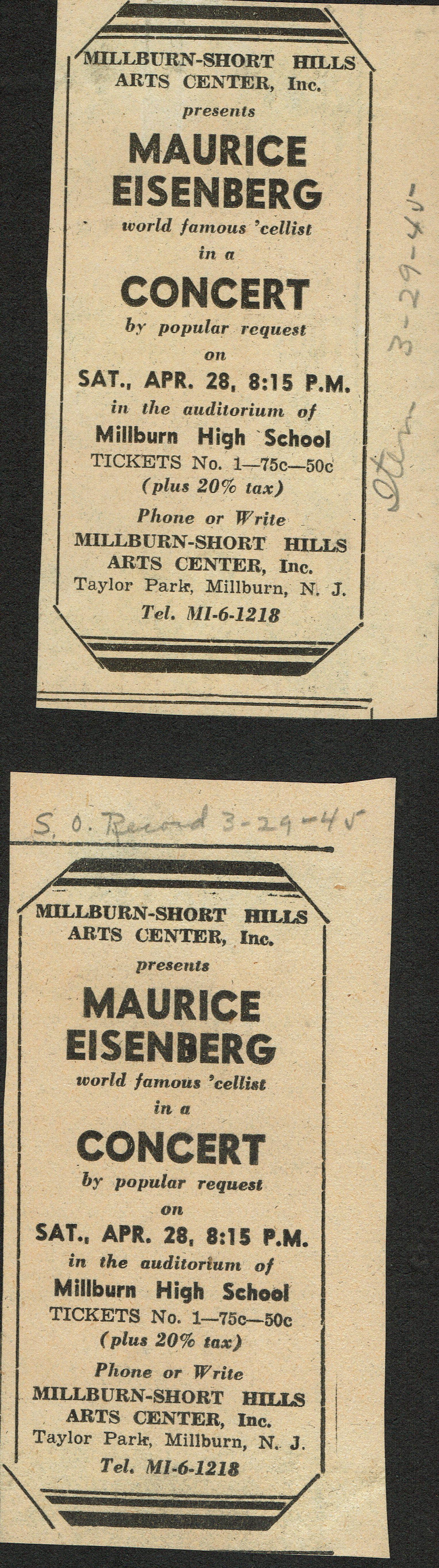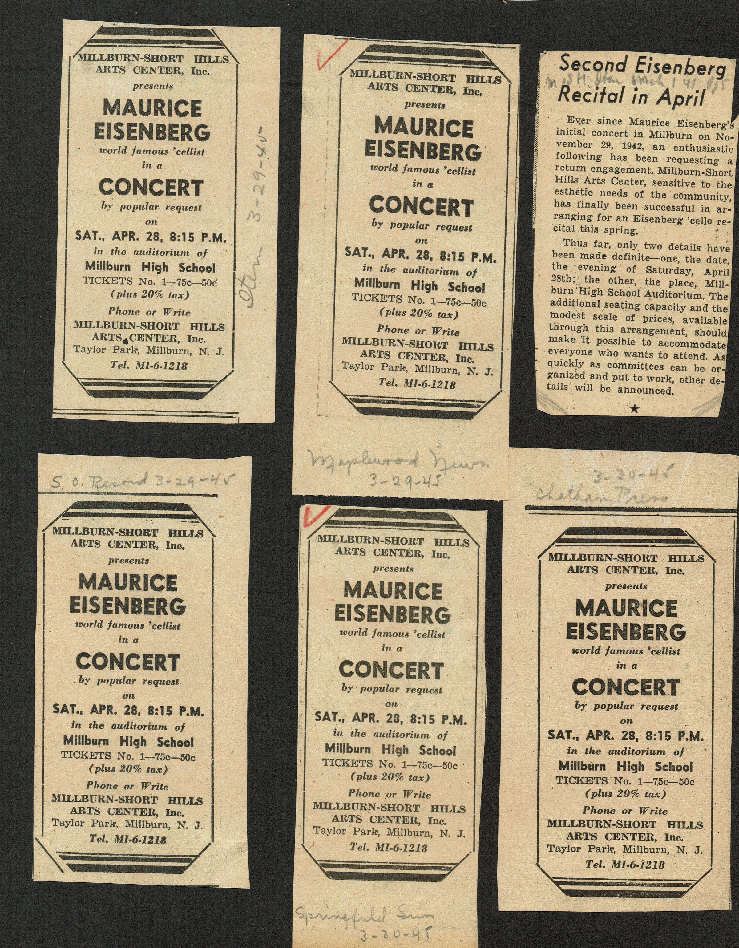 Millburn Art Center 1945 Scrapbook: Maurice Eisenberg Concert Advertisements, 1945