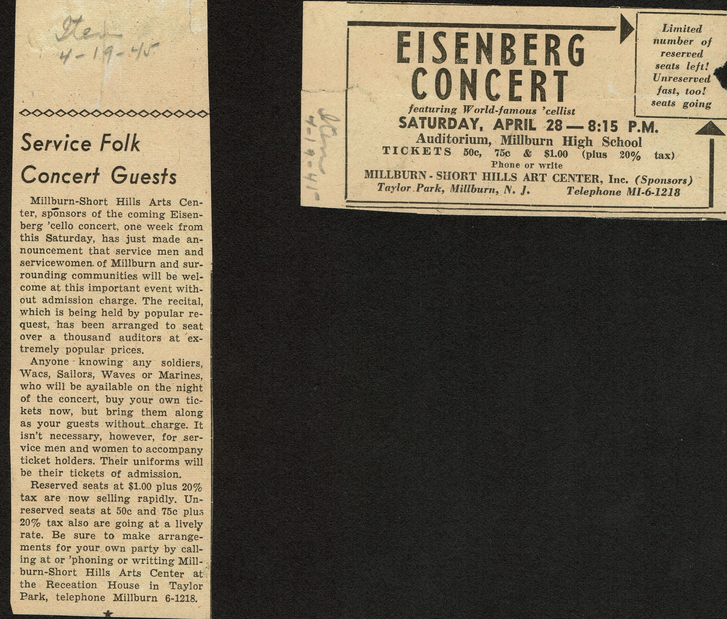 Millburn Art Center 1945 Scrapbook: Maurice Eisenberg Free Seats to Service People, 1945