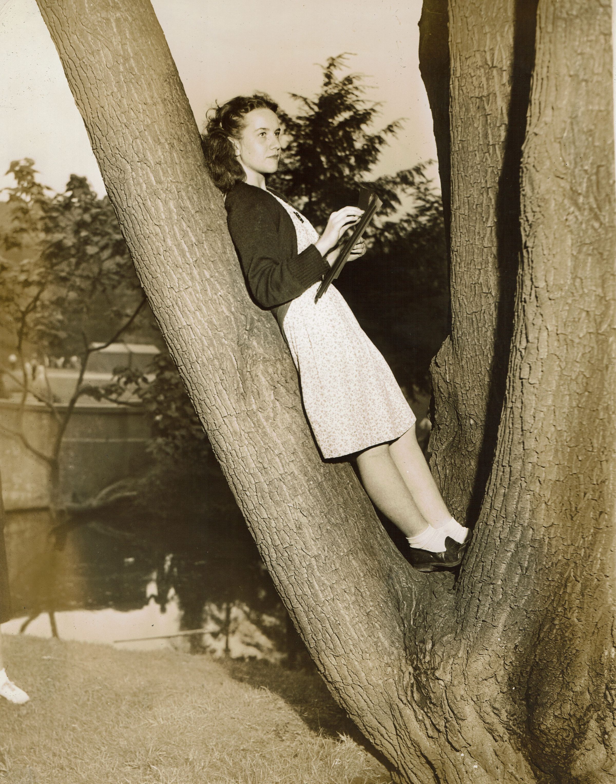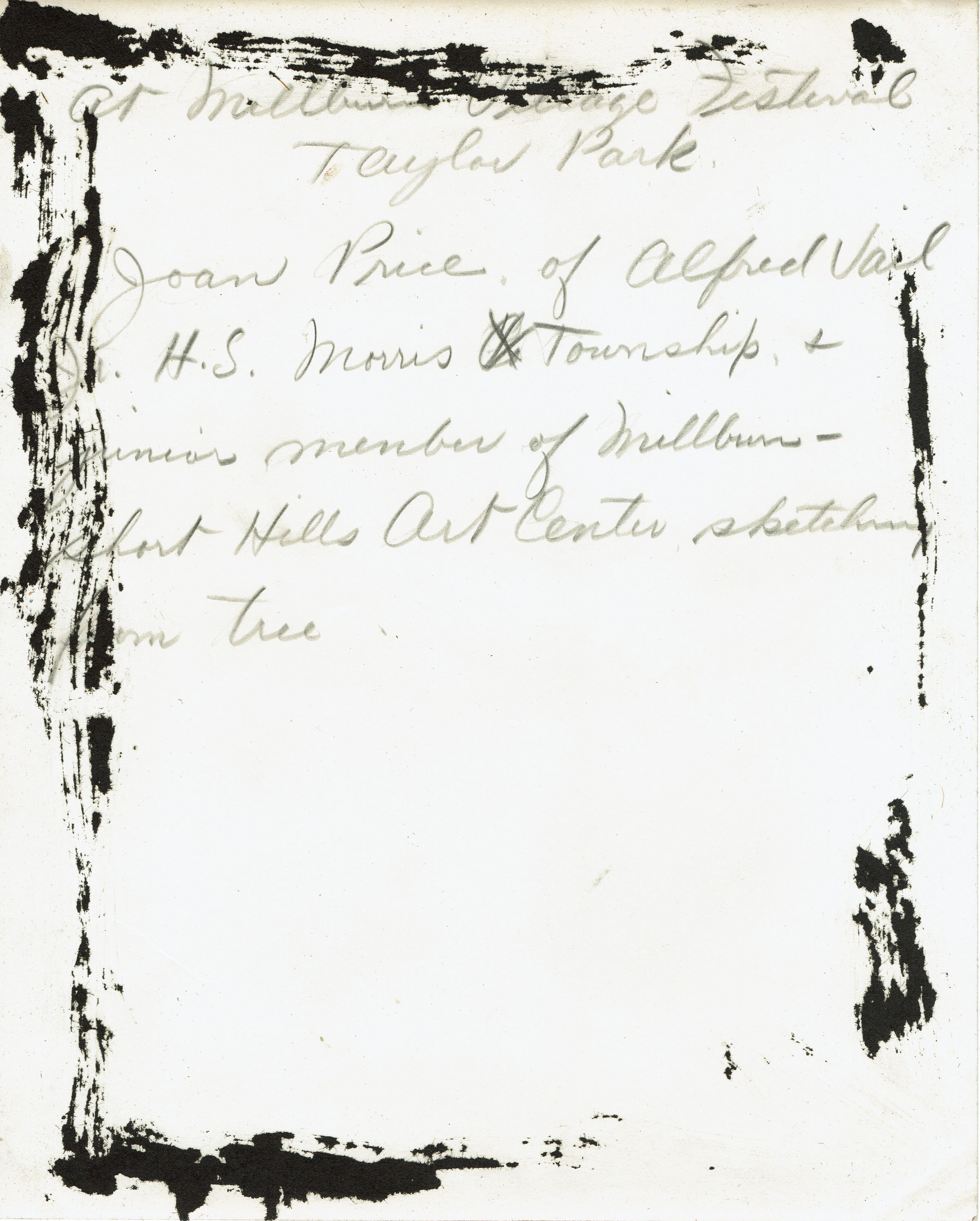Three photographs of art activities in Taylor Park from the second annual Village Festival, sponsored by the Millburn Art Center on June 2 & June 9, 1945. Inscriptions on the verso of photographs read: Joan Thompson of Alfred Vail Junior High School, Morris Township and junior member of Millburn-Short Hills Art Center makes sketch of lake; Joan Price of Alfred Vail High School, Morris township and junior member of Millburn-Short Hills Art Center sketches from tree. No inscription on the verso of third photograph.Collection