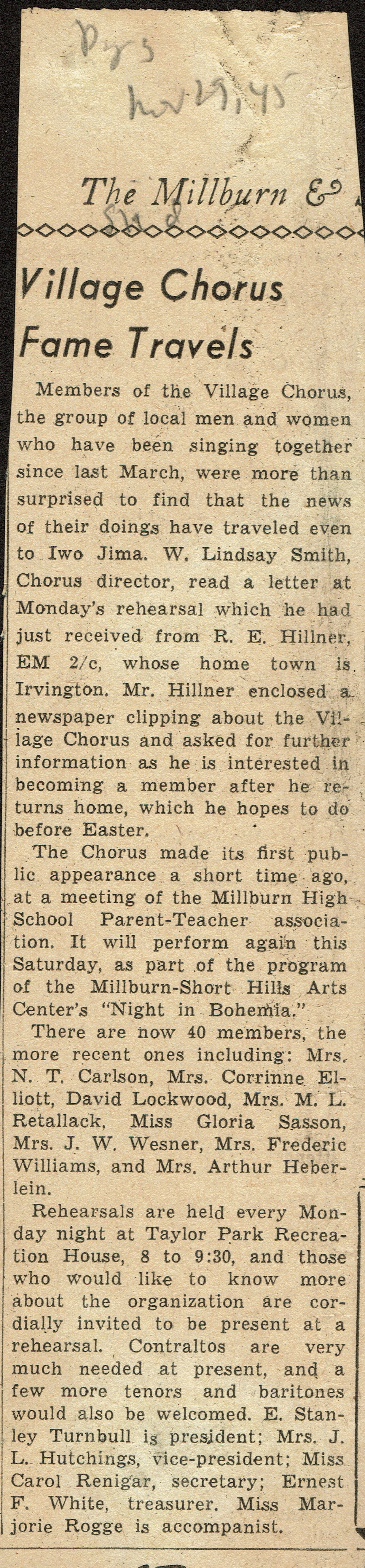 Millburn Art Center 1945 Scrapbook: Village Chorus Fame, 1945